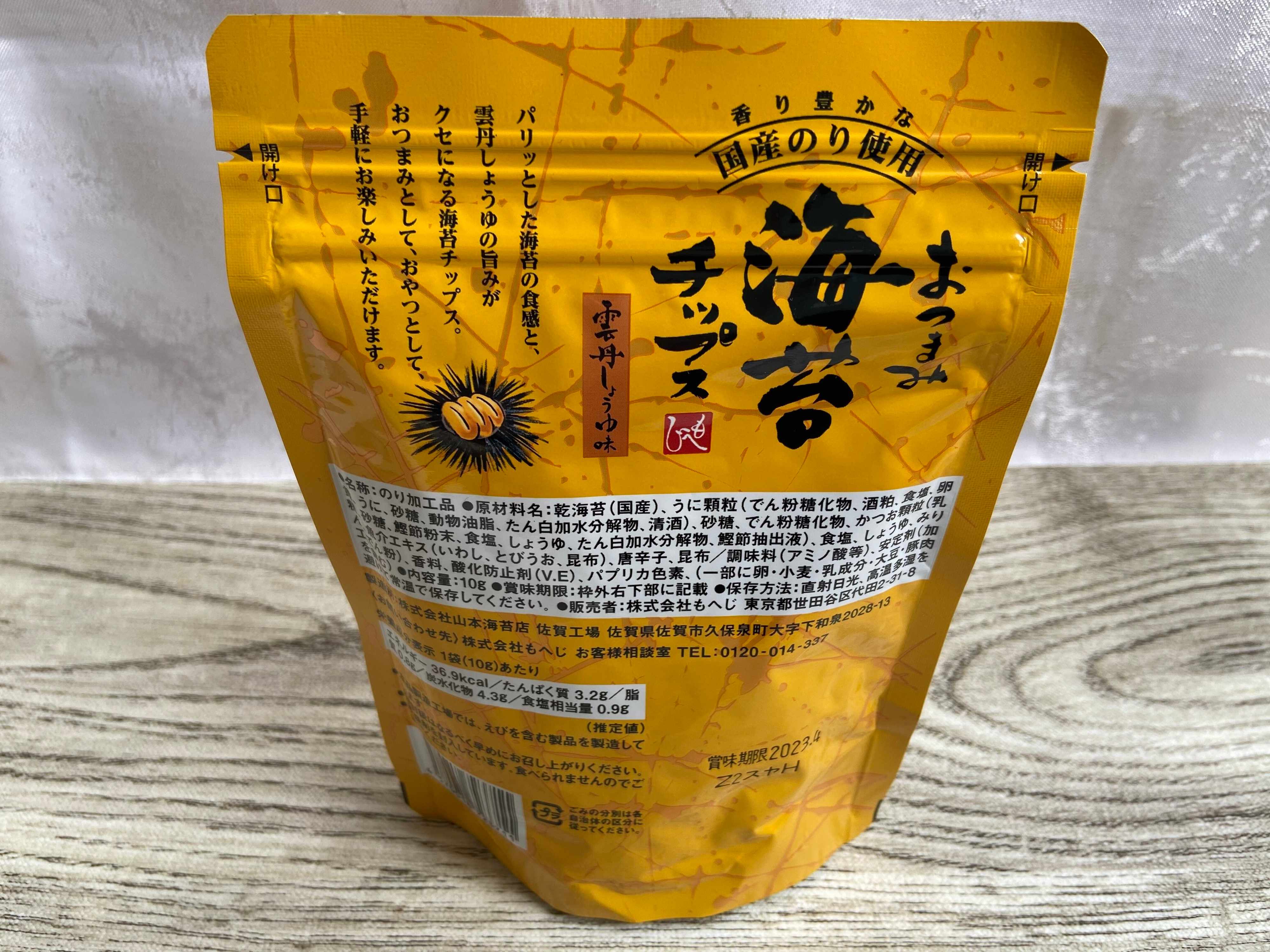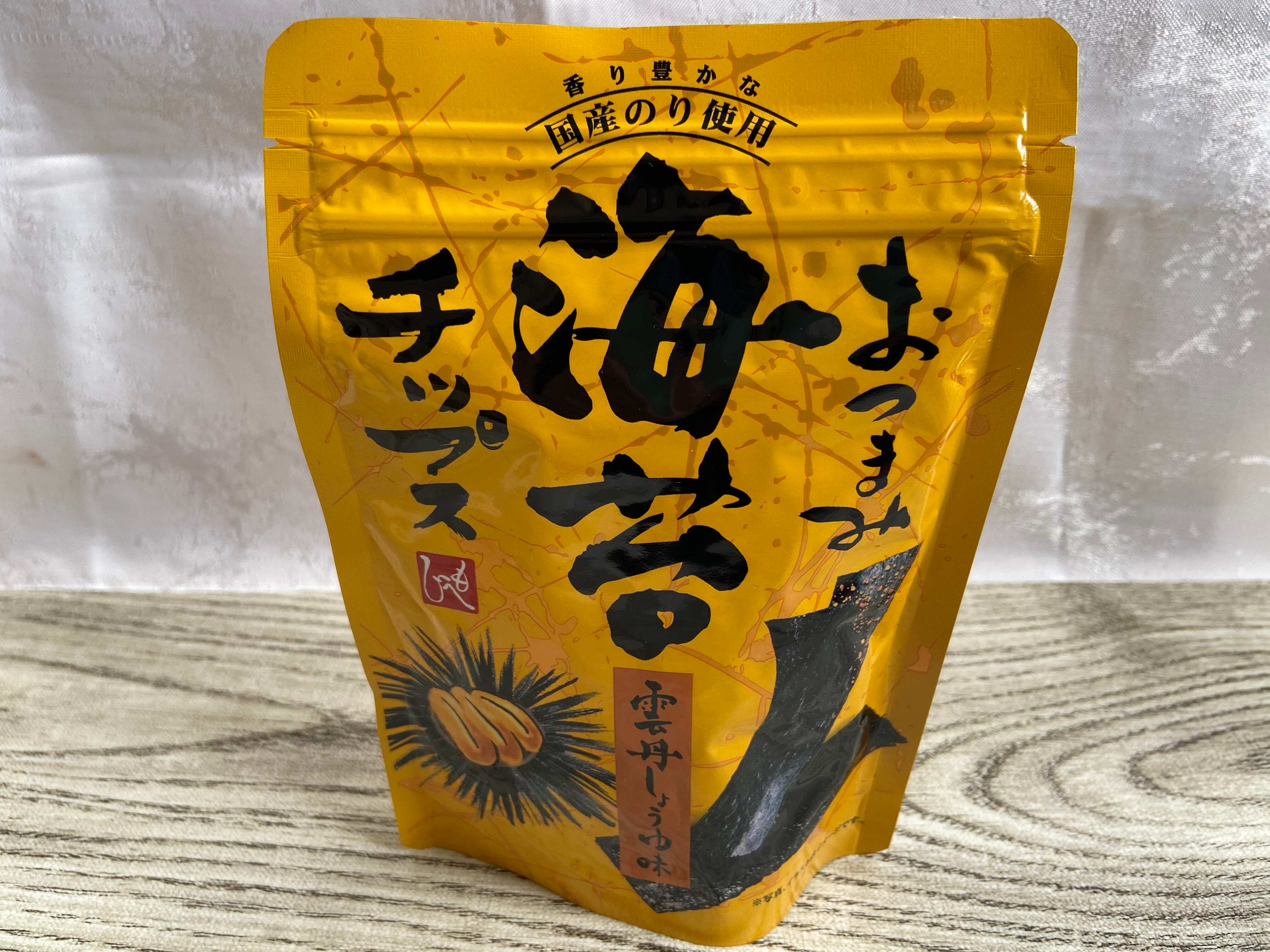 香り豊かな国産の海苔と、雲丹しょうゆの旨みがクセになる海苔チップスとのこと。