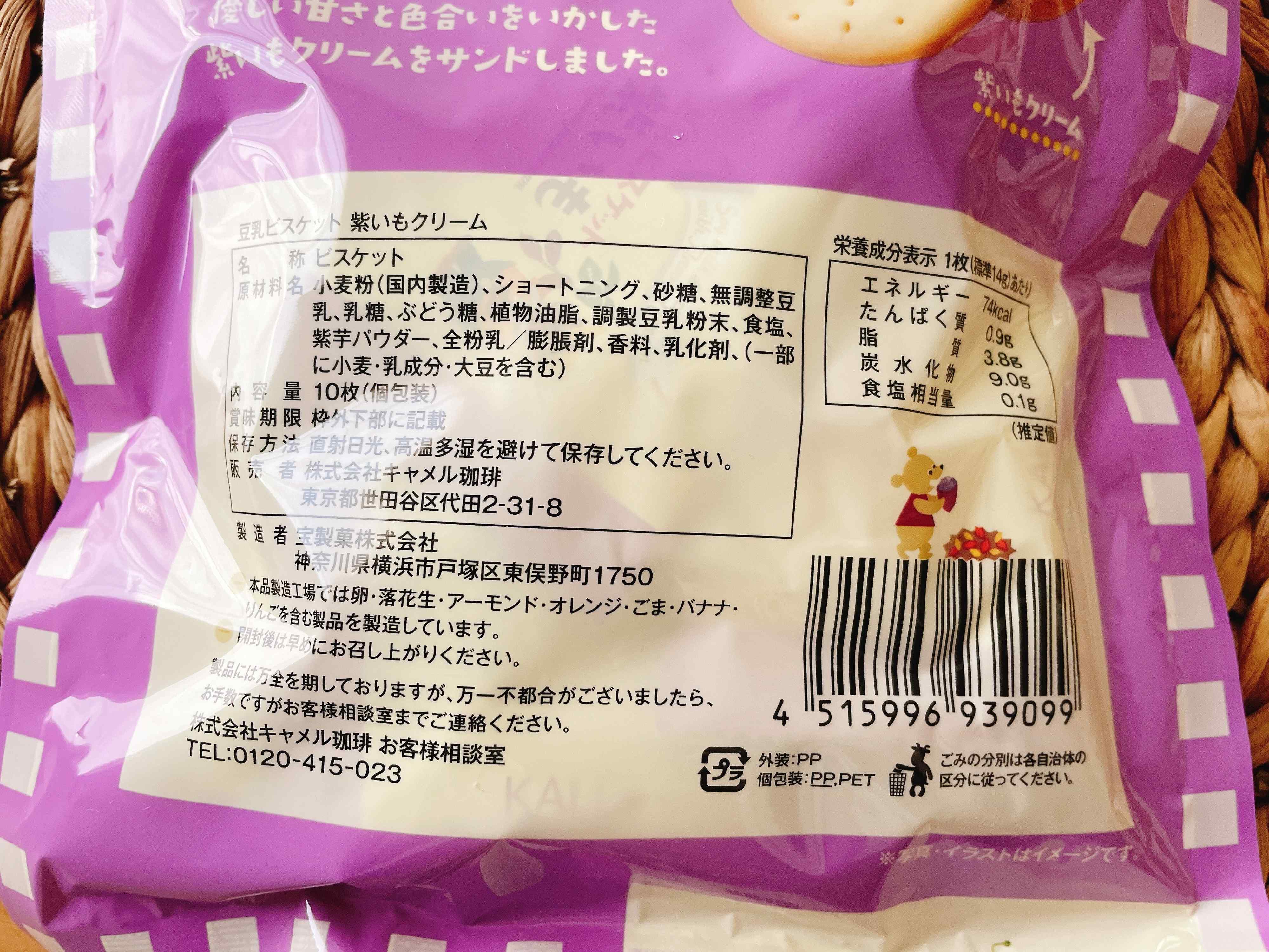 豆乳ビスケットの優しい味と、薄い紫色の優しい甘さの紫いもクリームがよく合っていて、つい次の袋に手がいってしまいます。