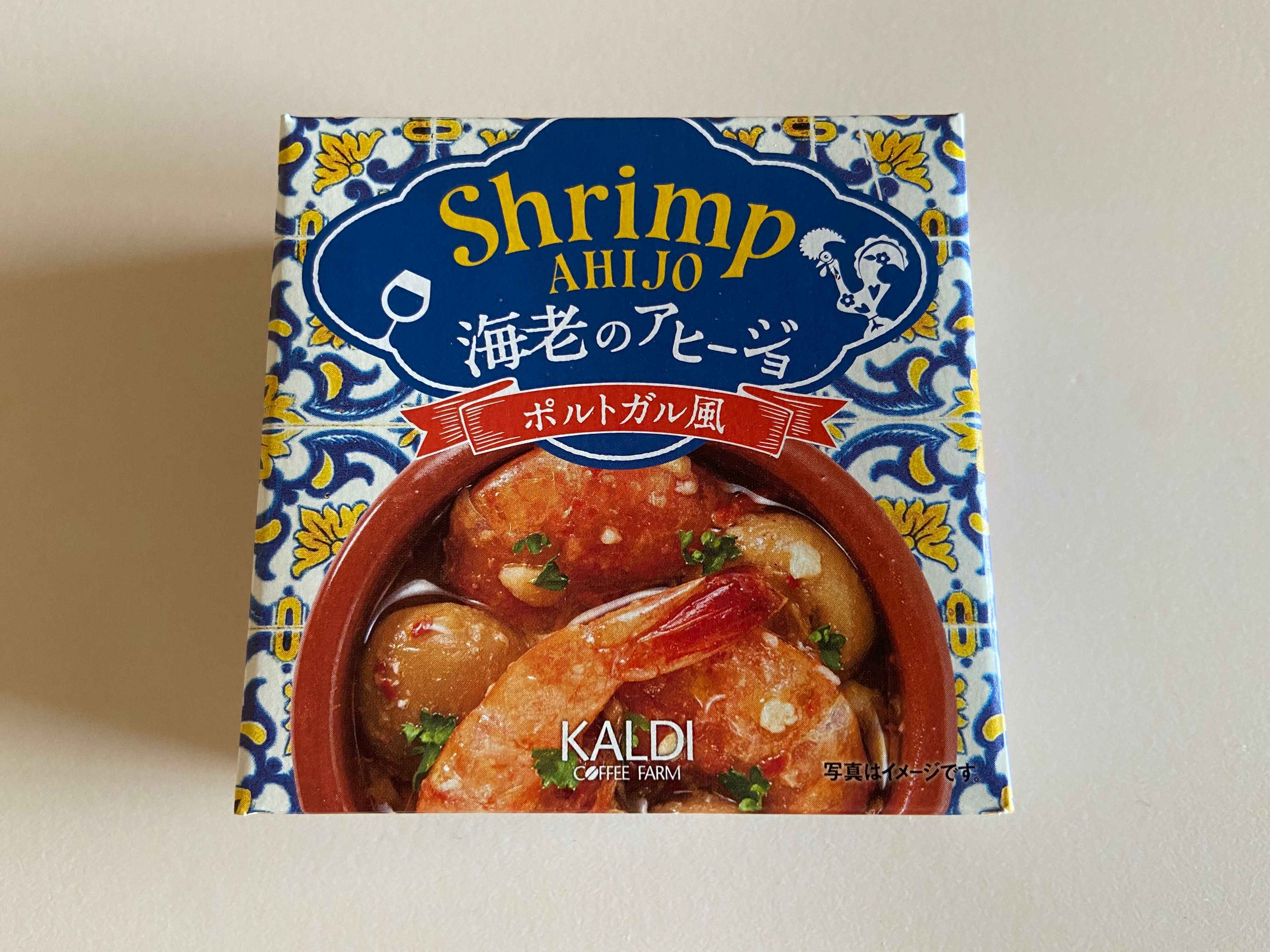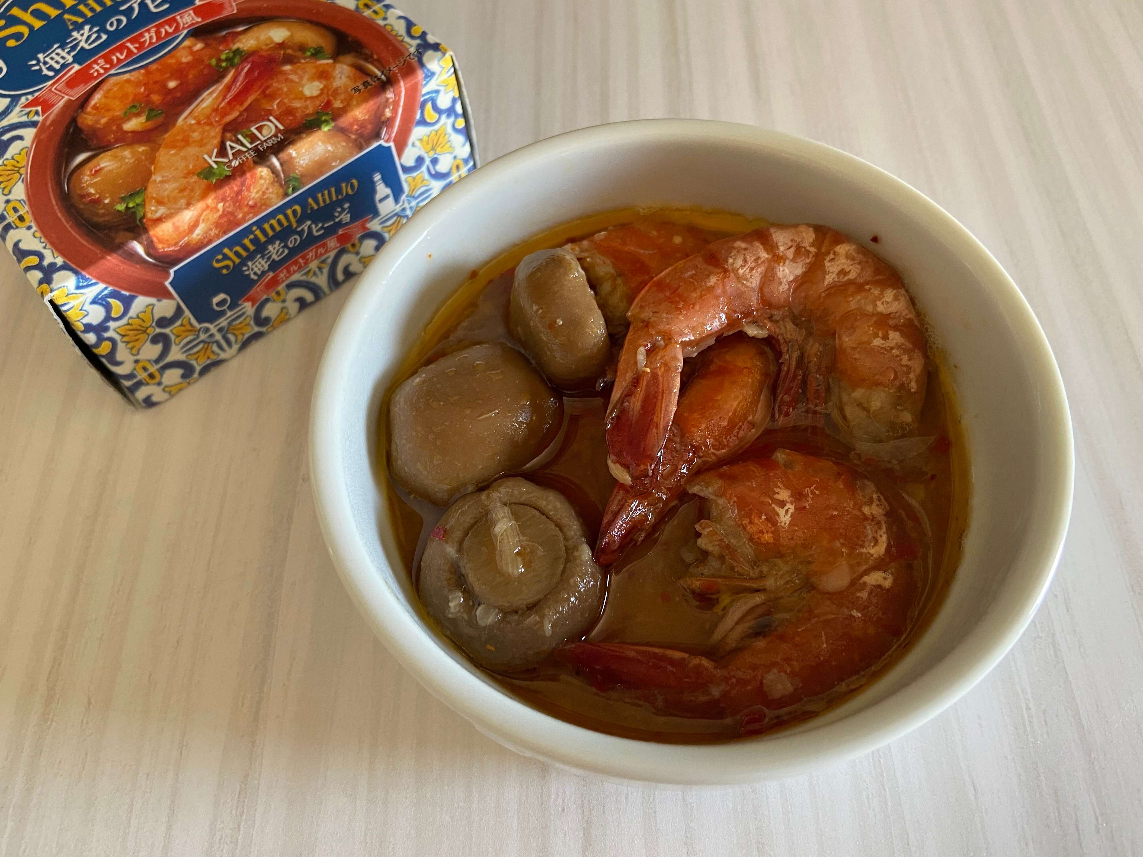 まずはこちら、おしゃれなデザインの箱が目を引く「海老のアヒージョ」(購入時:300円)。箱の中には缶詰が入っています。