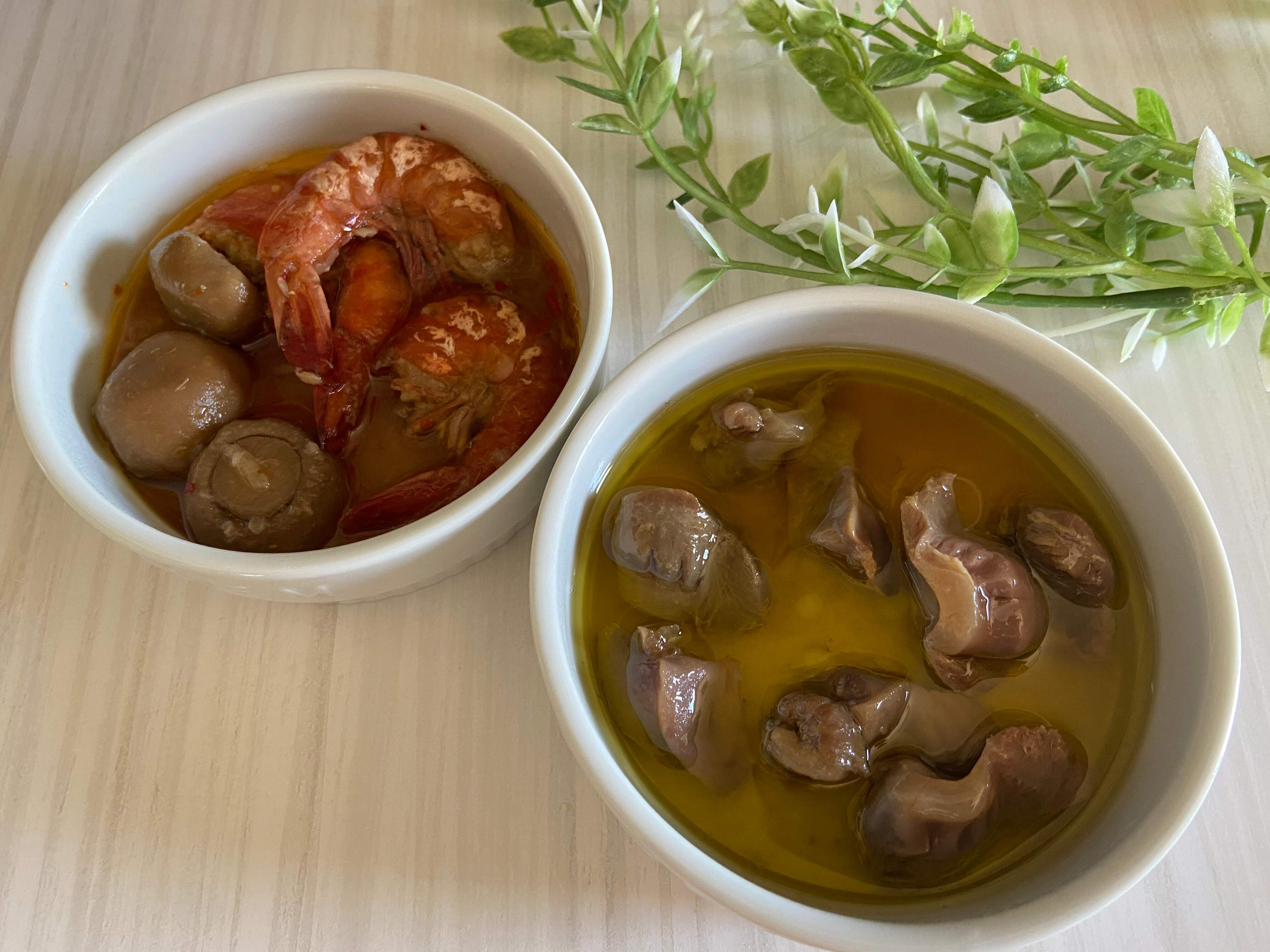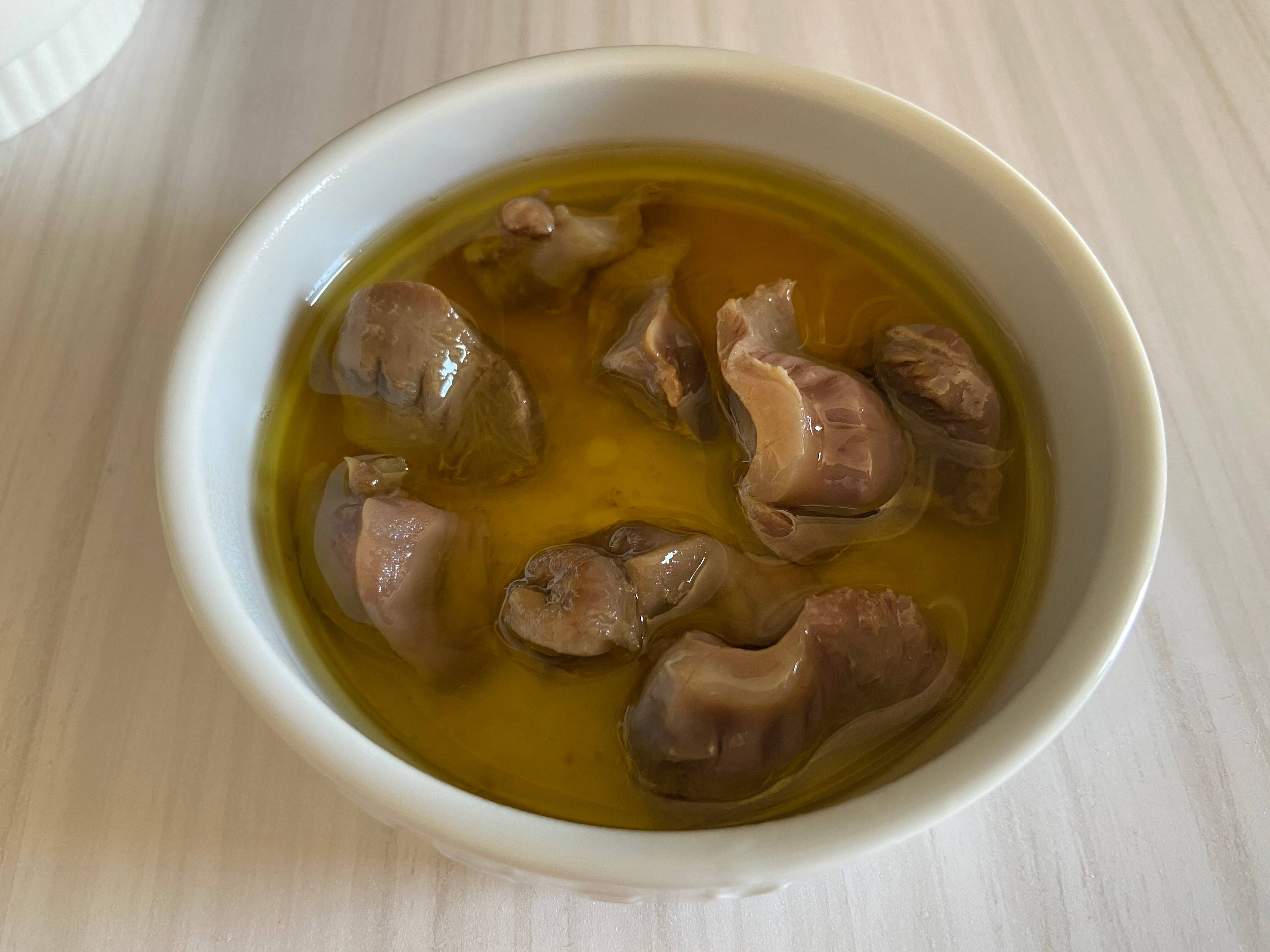 にんにくの効いたオリーブオイルに国産砂肝を使用。こちらも缶を開けて中身をお皿にうつし、レンジで温めてからいただきます。