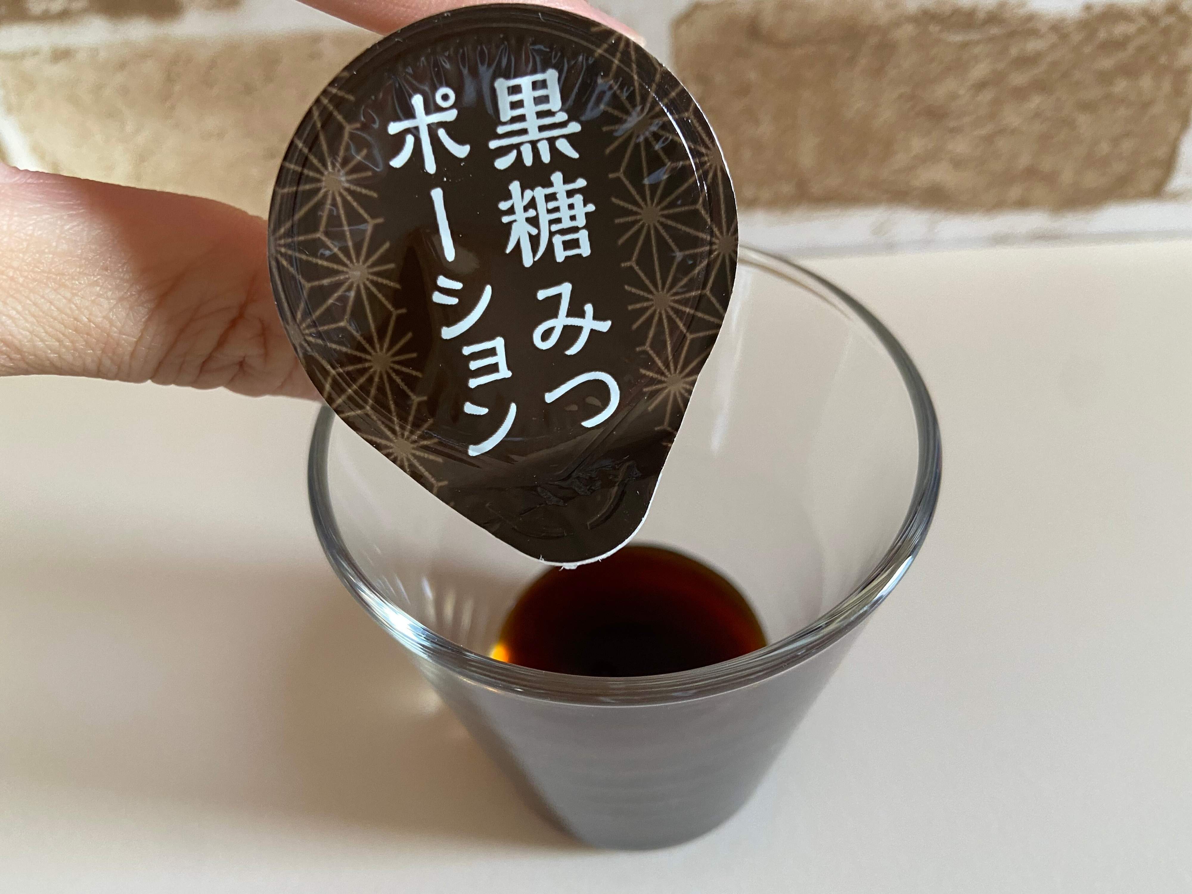 黒糖好きな筆者が愛用しているのはカルディの「黒糖みつポーション」(購入時:398円)。