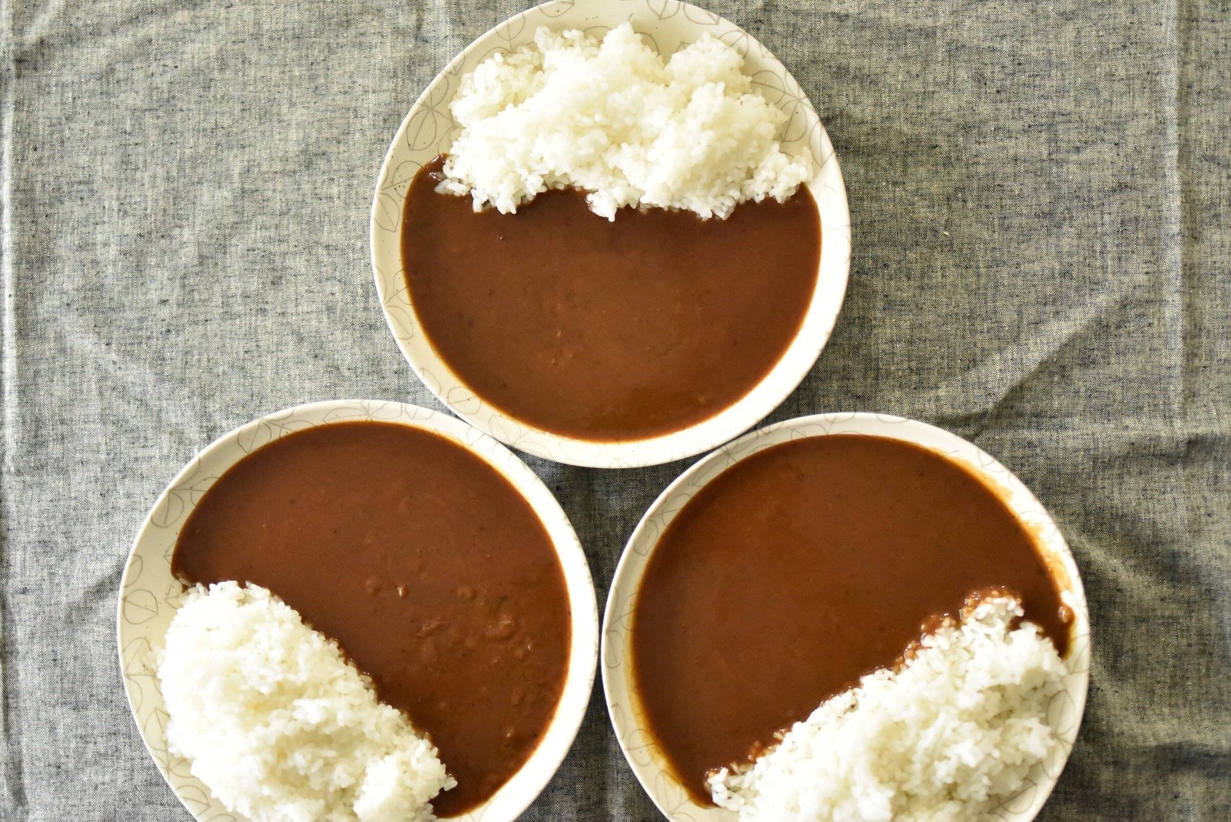 食べる前の色のイメージでは、辛口の方が黒っぽくて、甘口の方が黄色っぽいなど見た目の違いがあるのかなと思っていたのですが、実際並べてみたところ、色にはほとんど違いがありませんでした。また、3種とも具が溶け込んでいるタイプのサラサラとしたカレーです。