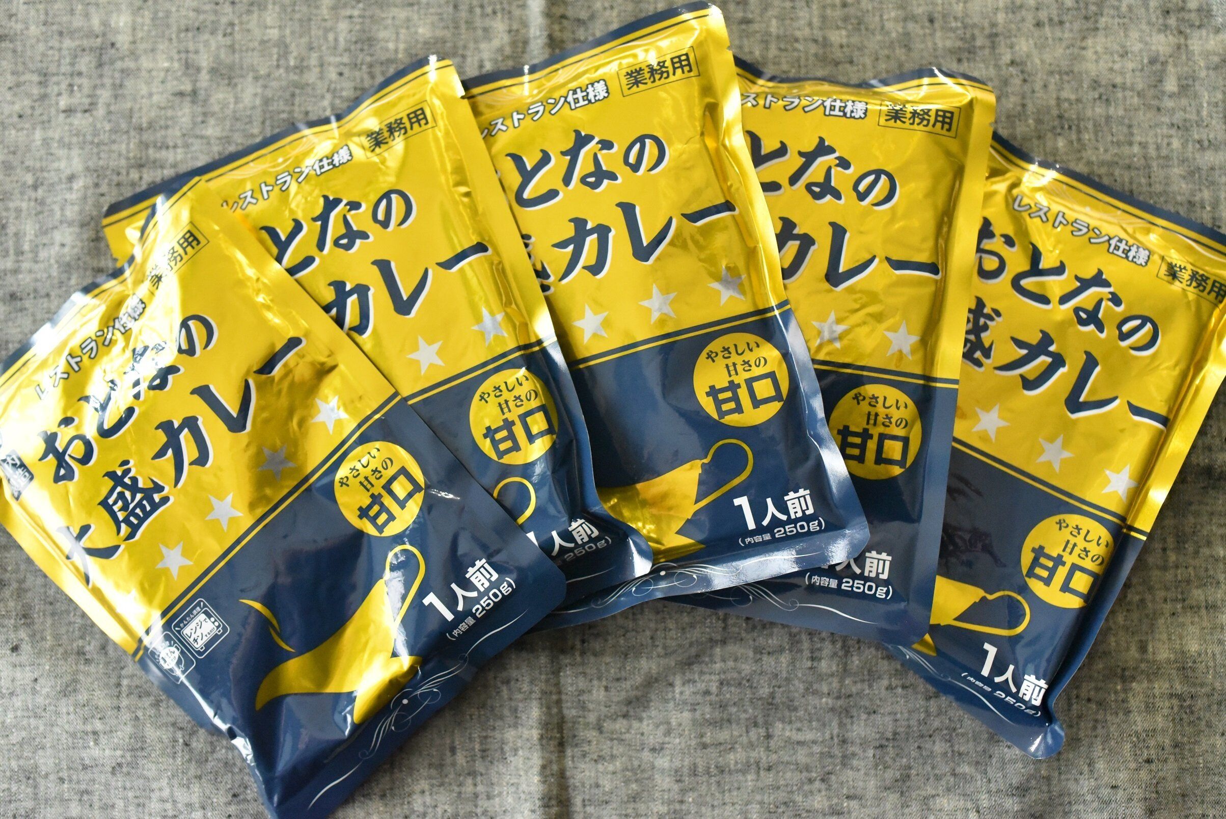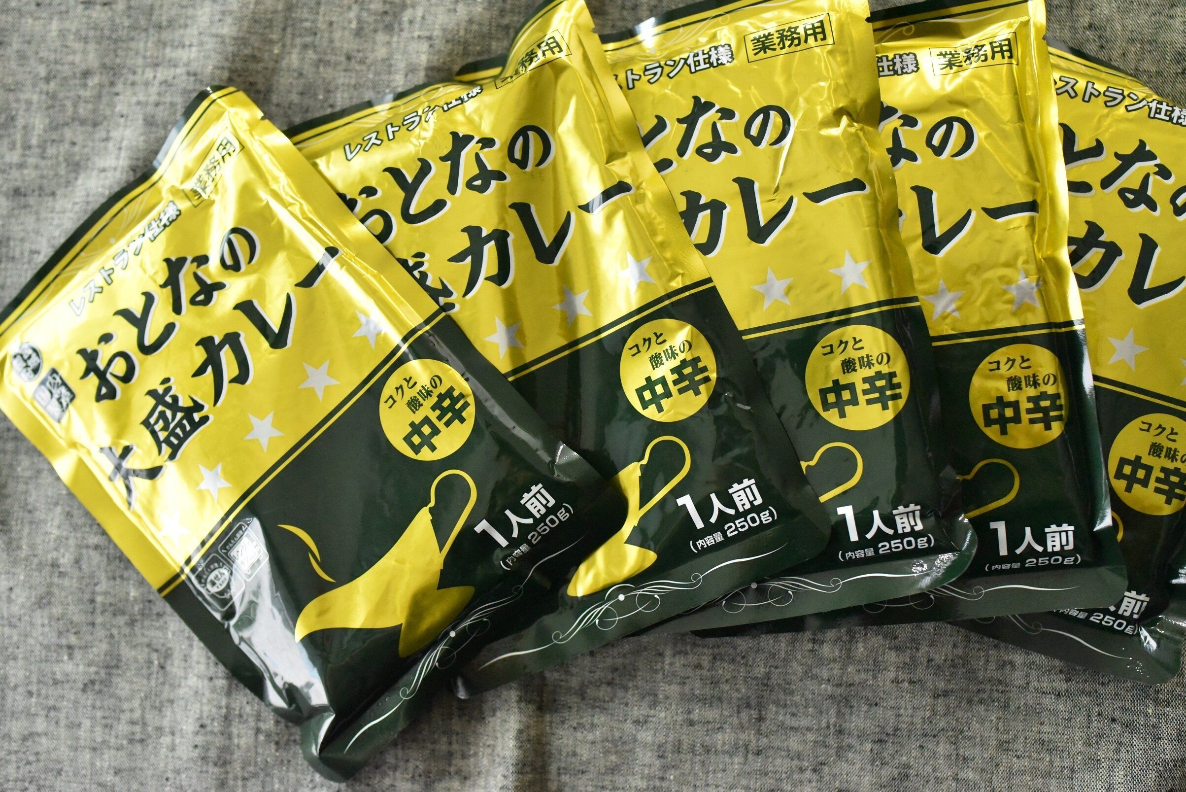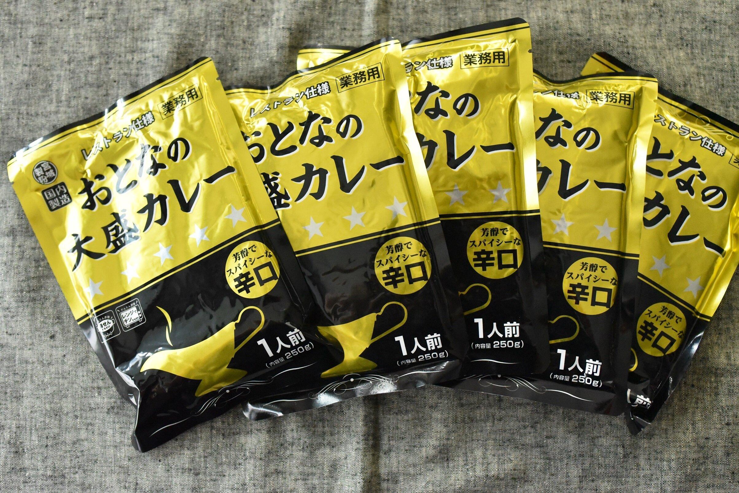 今回ご紹介するのは、業務スーパーの「おとなの大盛カレー」。辛口、中辛、甘口の3種類展開で、各5食入りで価格は297円です。