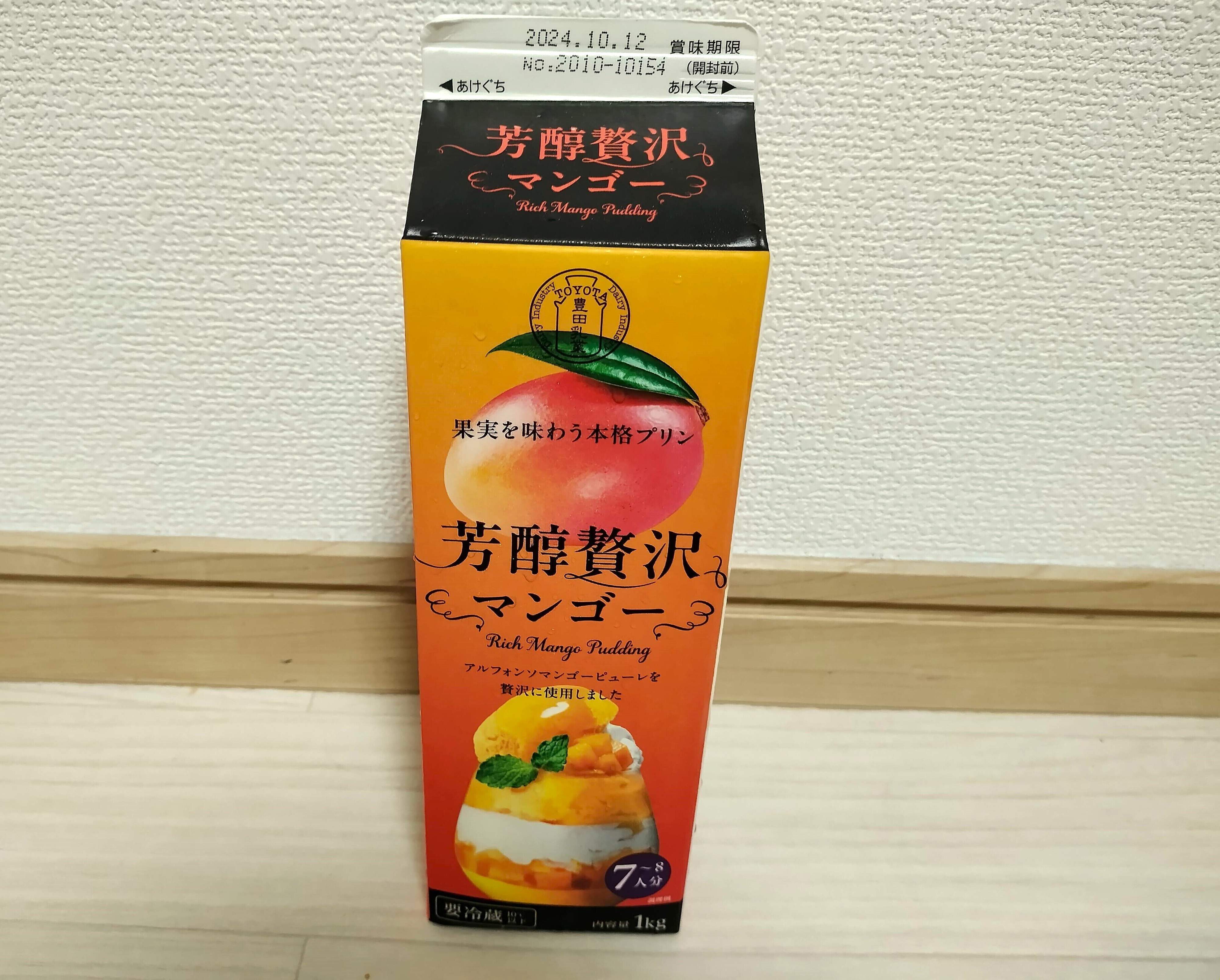 こちらがその「芳醇贅沢マンゴー」です。価格は1パック税込538円です(2024年8月筆者購入時)。1パックに1キロのマンゴープリンが入っており、超大容量なマンゴープリンです。業務スーパーで販売されている紙パックスイーツの中では高めな価格なので、最初は躊躇しましたが思い切って買ってみました。