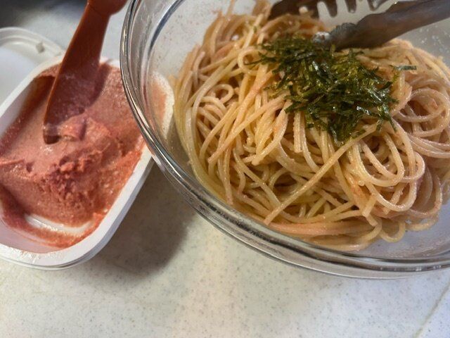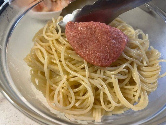 茹でた麺にも混ぜてみました。麺が熱いうちにたらこスプレッドと混ぜ合わせます。
