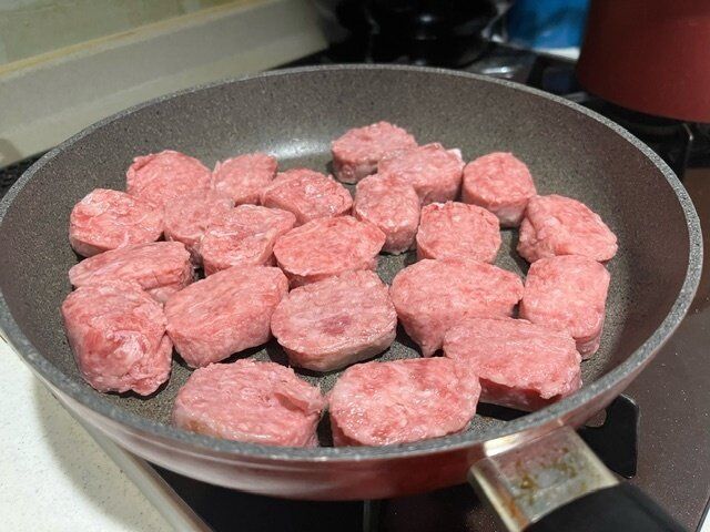 牛肉は普通にフライパンで焼きます。塩胡椒を軽くしてから焼きます。