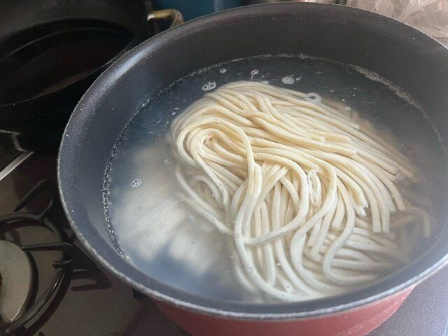 まずはたっぷりのお湯でめんを茹でます。生めんですが太めんなので10~13分ほどしっかり茹でます。