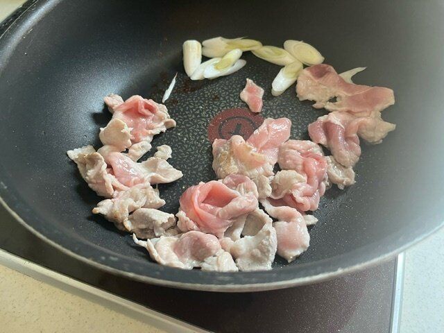 めんが茹で上がる直前に具材をフライパンで焼きます。