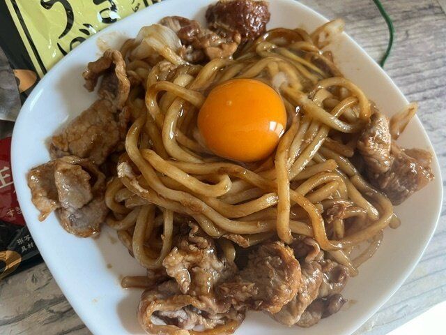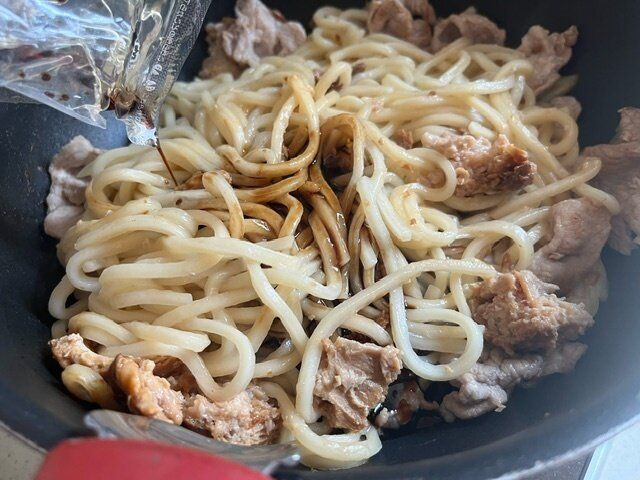 めんは茹でてから使うからもっちもち。甘辛いすき焼き味が美味しい。
