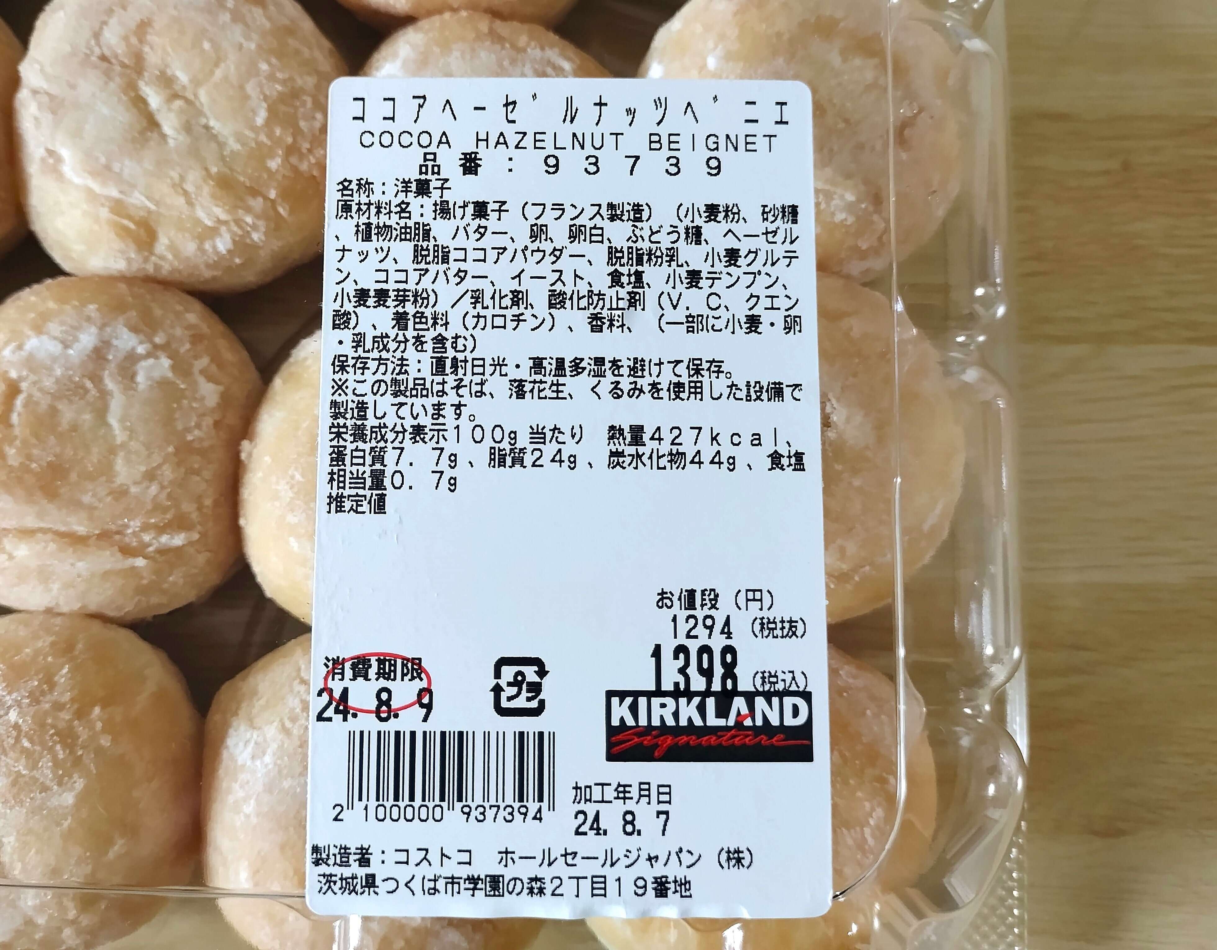 コストコで買える「ココアヘーゼルナッツベニエ」は価格は25個入りで税込1,398円(2024年8月筆者購入時)。1つあたり55.92円とリーズナブルな価格でベニエを楽しめます。