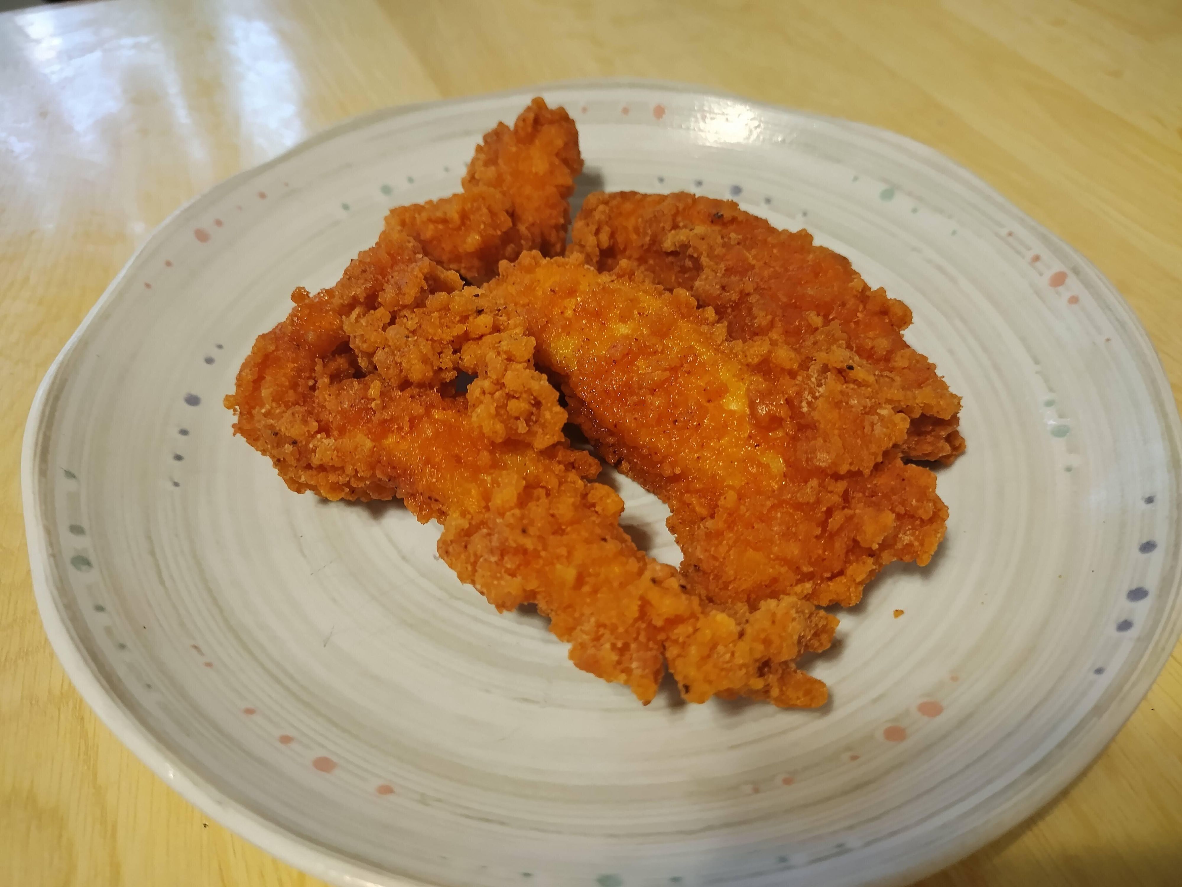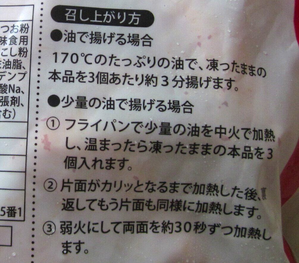 170度の油で3分(3個当たり)揚げて完成です。衣が赤く、ぴりりとした唐辛子の辛味が特徴のフライです。