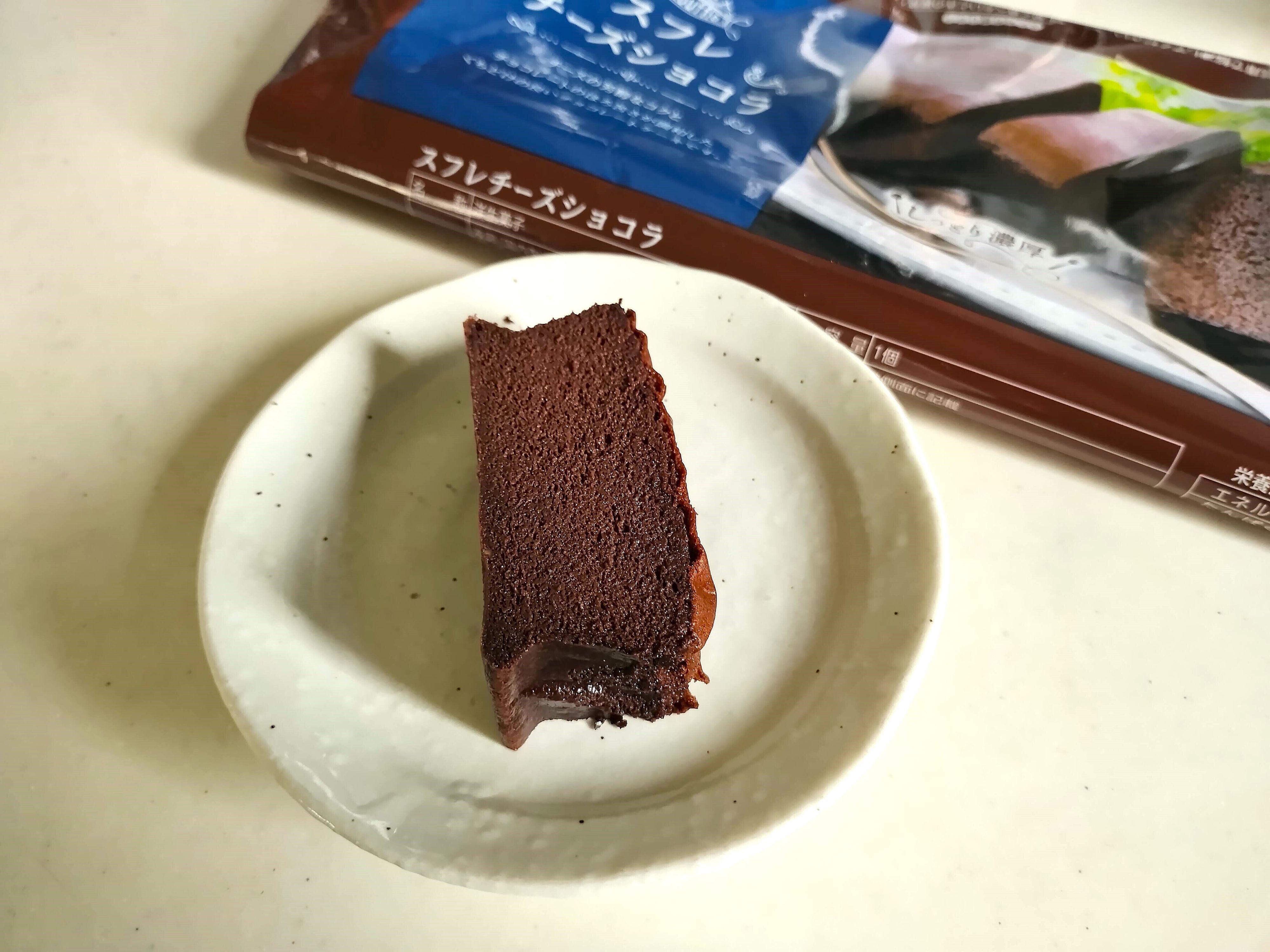 それでは早速いただきます。1口食べると、ふんわりした優しい甘さが口いっぱいに広がります。スフレチーズケーキと同様にほんのり卵の味がしますが、チーズの香りは控えめです。その代わり、チョコはしっかり感じます。チョコレート好きな3歳娘はパクパク食べていました。