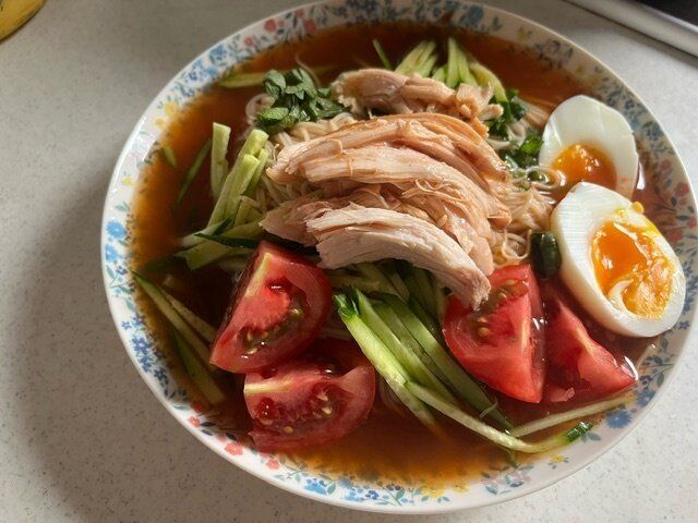 今回はトッピングにきゅうり、大葉と今が旬のトマトとお刺身の代わりに茹で鶏を用意しました。