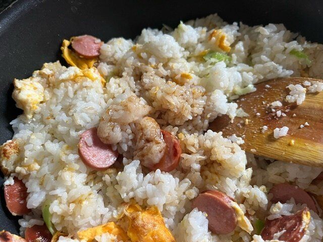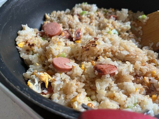 作り方はいつものチャーハンと一緒。フライパンで卵を炒め、今回はチャーシューの代わりにソーセージを入れました。あとはネギもたくさん。よく炒めます。