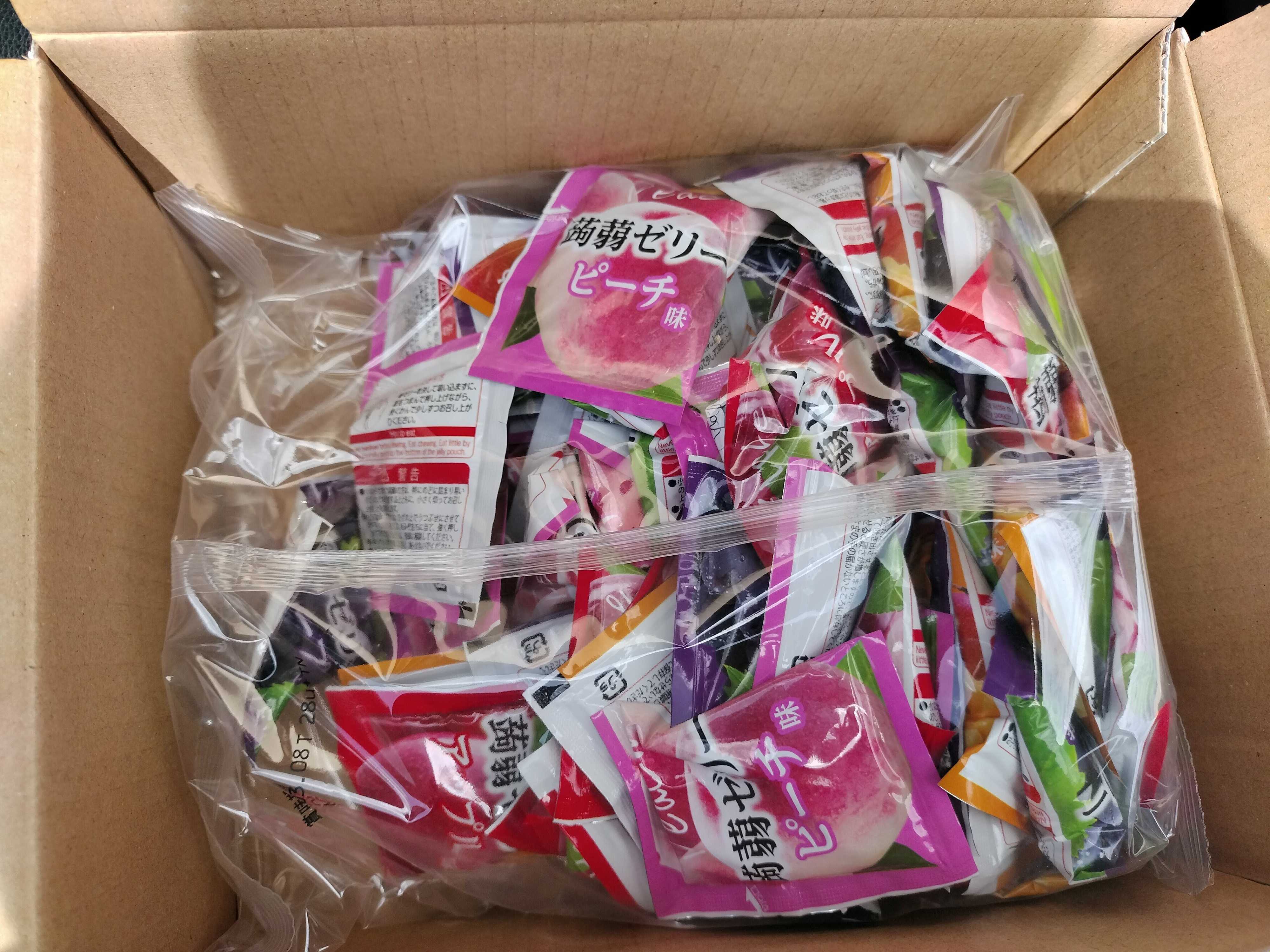 「4種のフルーツ こんにゃくゼリー 80個入り」の箱を開けるとこんな感じでどっさりと入っていました。グレープ・ピーチ・アップル・マンゴーの4種類のフレーバーのこんにゃくゼリーが入っています。4種類入っているので好みが分かれますが、我が家ではマンゴー味が一番人気でした。