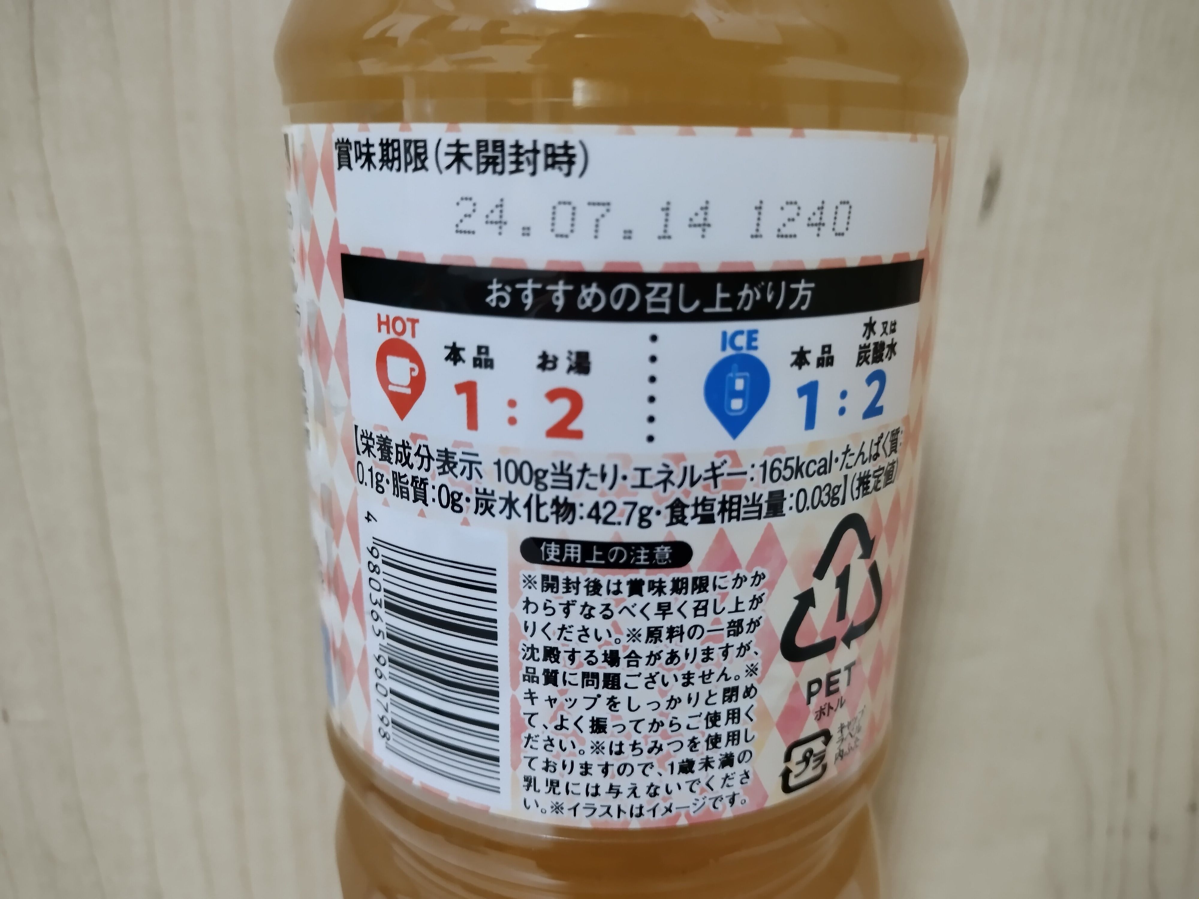 業務スーパーの「はちみつジンジャー」は、1本あたり税込429円(※2024年3月筆者購入時)です。内容量は1リットル。そのまま飲むタイプではなく、1:2で割って飲む希釈タイプのドリンクです。