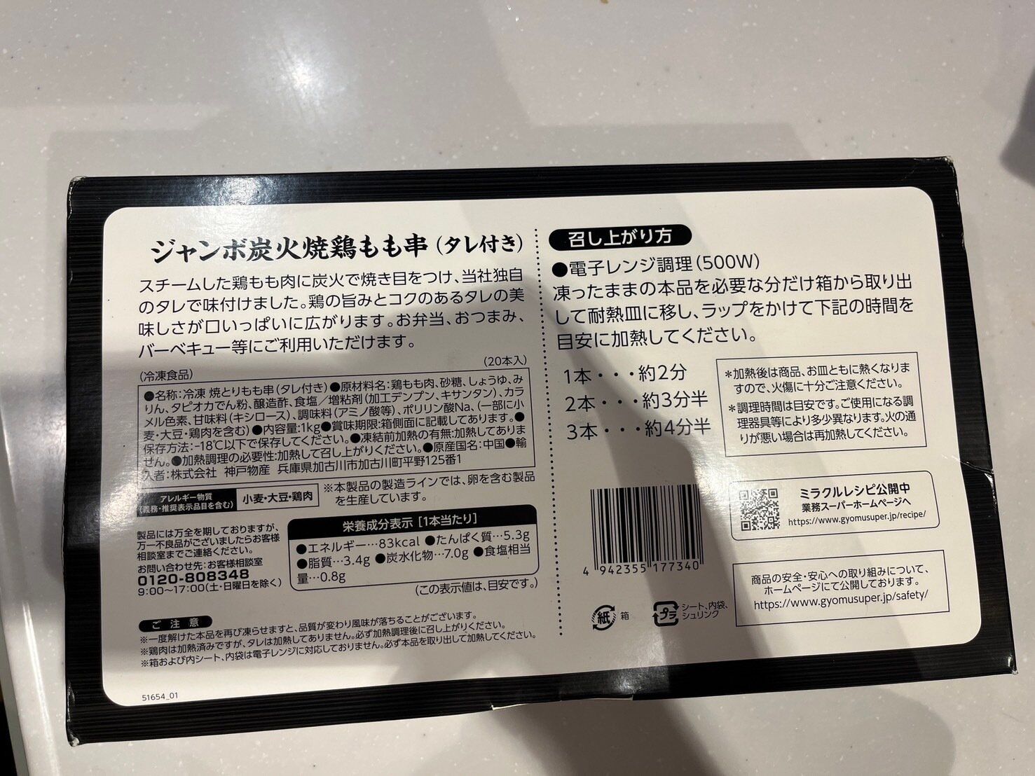 ジャンボサイズの焼き鳥が20本、なんと全部で1kg入っています。価格は1,382円でした。 1本あたり約69円です。