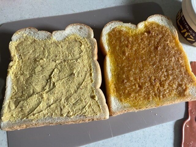 塗ったらトースターで焼きます。まずは3分くらい焼きます。比べると焼き色がつきました!