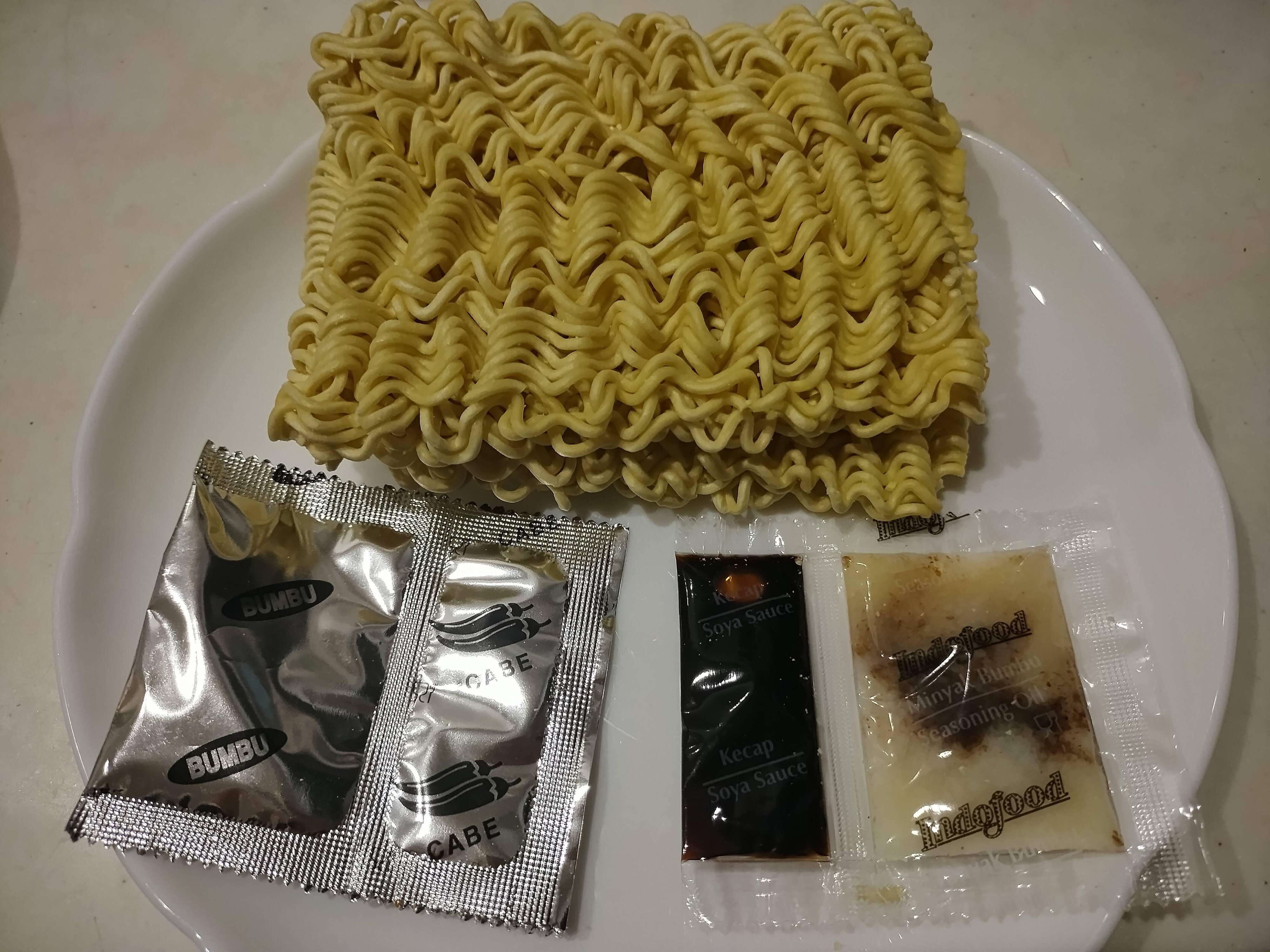 袋を開けると、インスタント麺と4種類のBumbu(ブンブ・調味料の意味)が入っています。Cabeと書かれたものは、絵の通り唐辛子です。こちらを入れなくても他の調味料に辛みがついているので、全く辛くせずに食べることはできないのですが、辛味が苦手な方はこちらは入れないのがおすすめです。