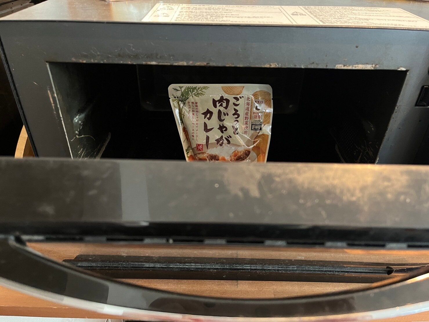 レンジの中で袋を立たせて加熱します。(レンジ内が汚れているため半開きで失礼します。)