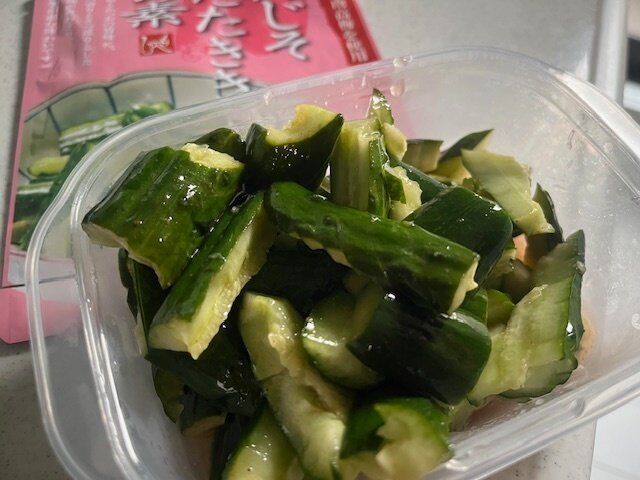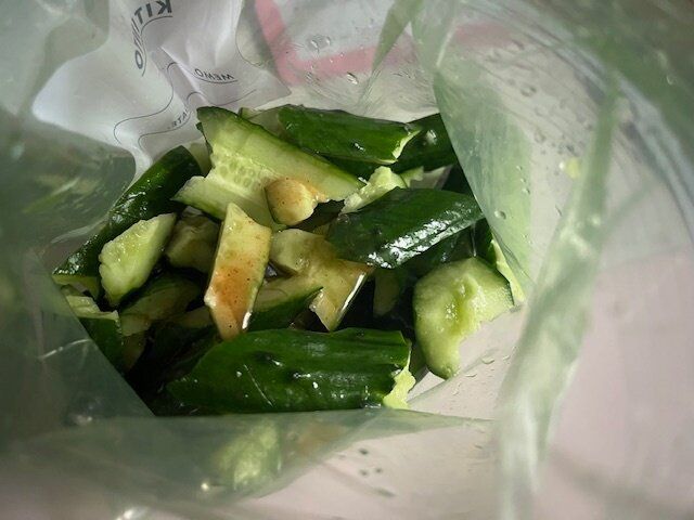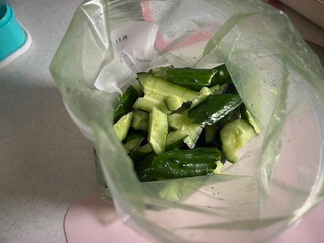 きゅうりは叩いて袋に入れます。私は味がよく染みこむように切れ目も入れてみました。