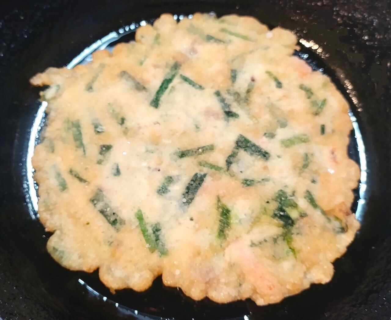 海鮮チヂミの名前の通り、イカがたくさん入っています。それだけではなく、ニラやたまねぎなどの野菜も入っています。