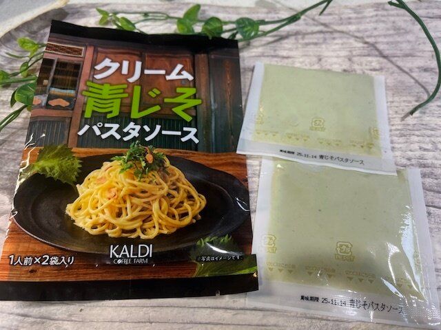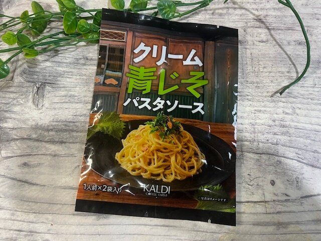 まずはこちら。【カルディ】「クリーム青じそパスタソース」1人前×2袋 213円(税込み)