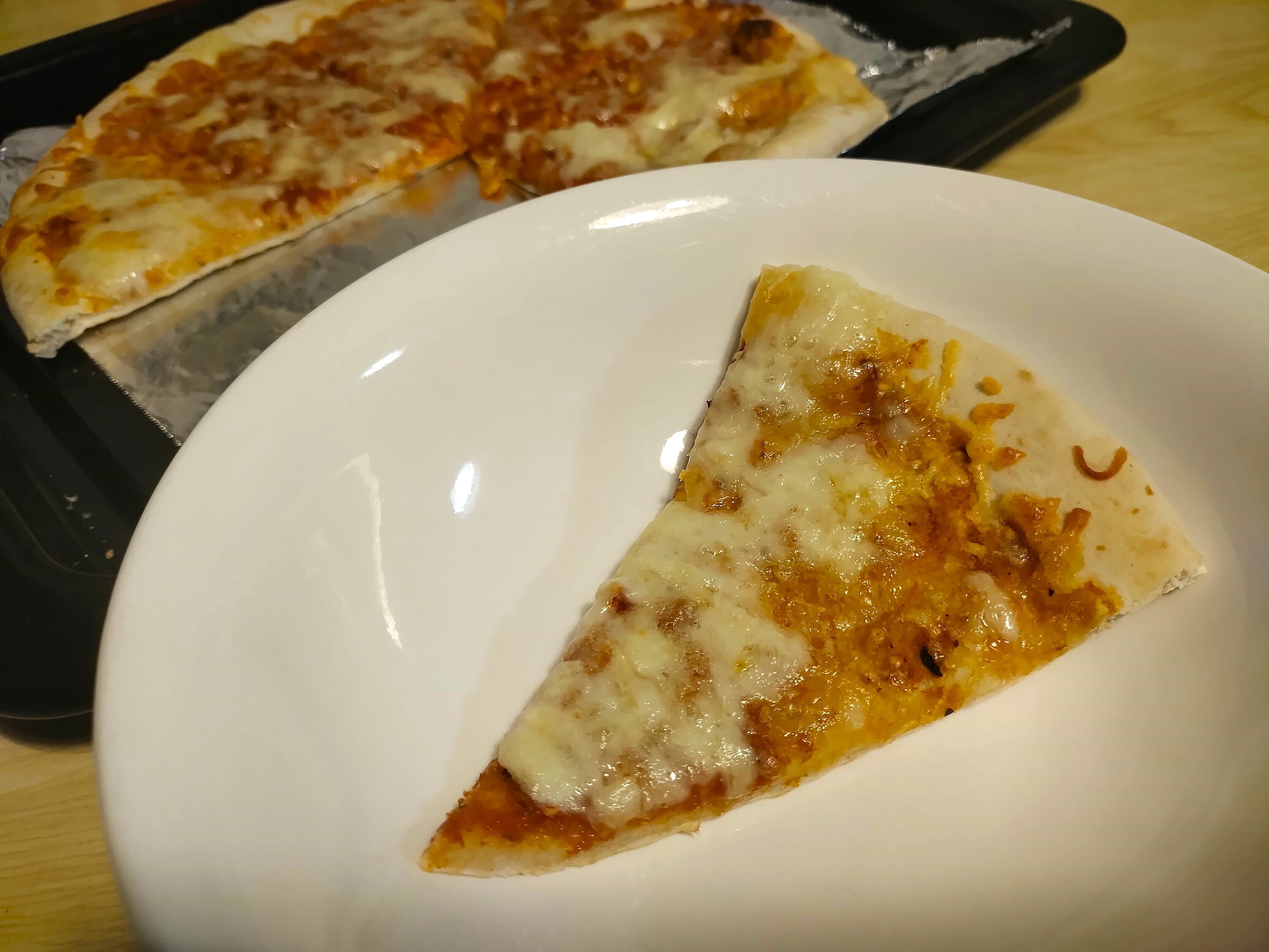 チーズがたっぷり乗っていて、少しオレガノの香りがします。オレガノの香りがやや強い印象がありますが、それ以外は日本で一般的に販売されているピザと比べてみても大差ないように感じます。シンプルな味わいのピザです。