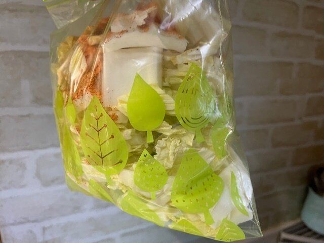 作り方は本当に簡単。白菜を好きな大きさにカットしたら、保存袋などに入れその上にこの「キムチの素」をいれるだけ。