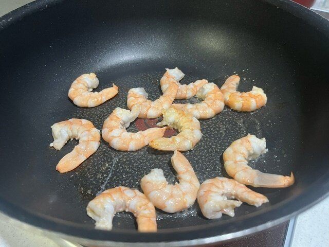 油をひいたフライパンで、海老や肉、好きな野菜等を炒めます。私は海老をたくさん使う事にしました。