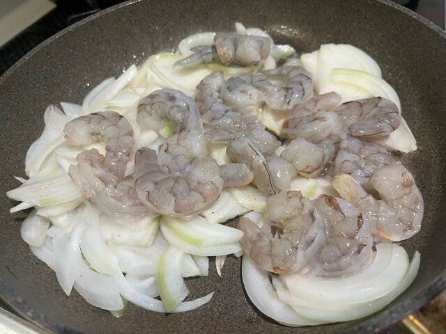 スライスした玉ねぎと背わたをとって殻をむいた海老をフライパンで炒めます。
