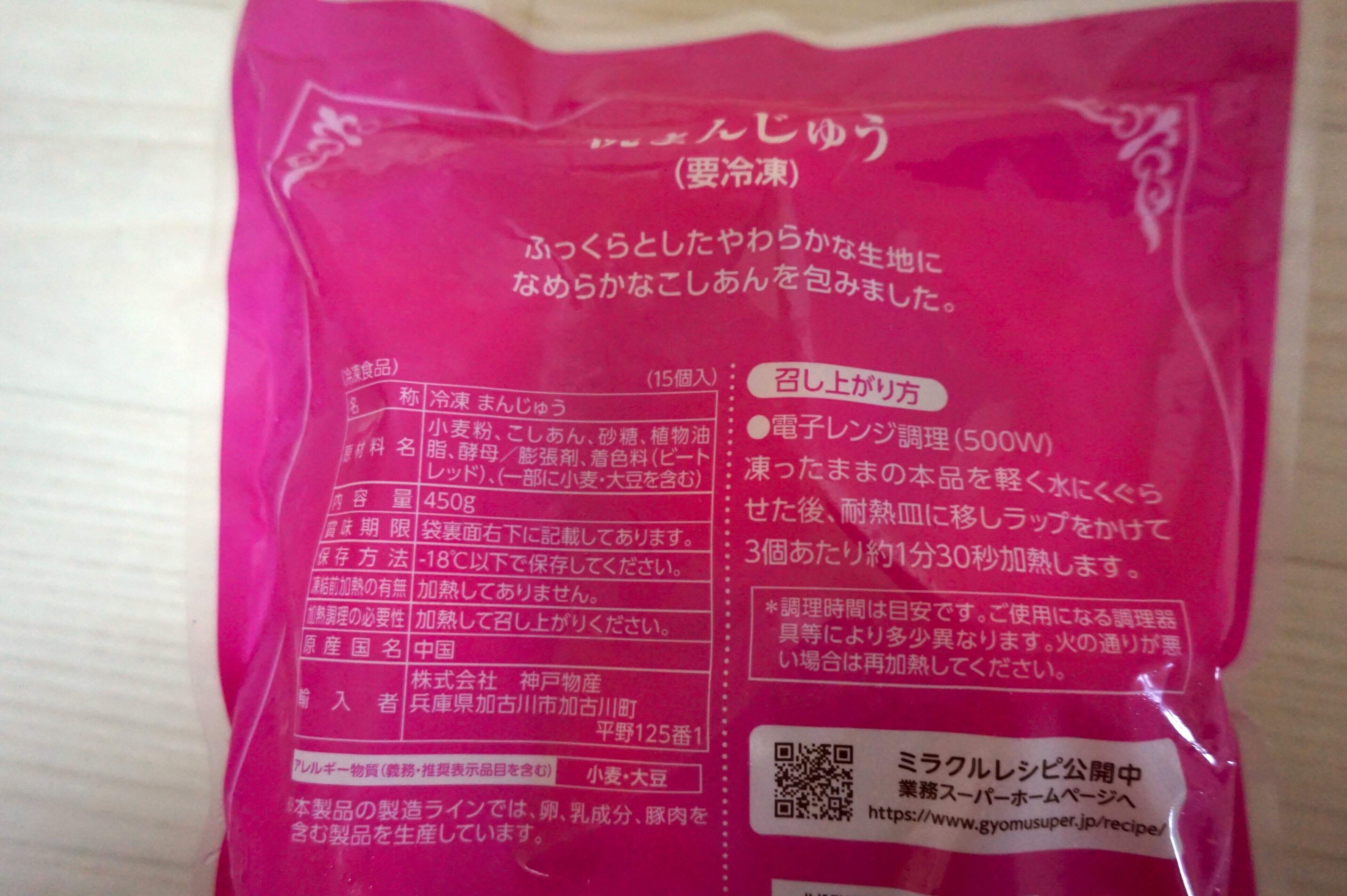 パッケージ裏面には、凍ったままの桃まんじゅうを軽く水にくぐらせたらお皿に乗せ、ラップをかけて500ワットの電子レンジで3個当たり1分30秒加熱すると書かれています。