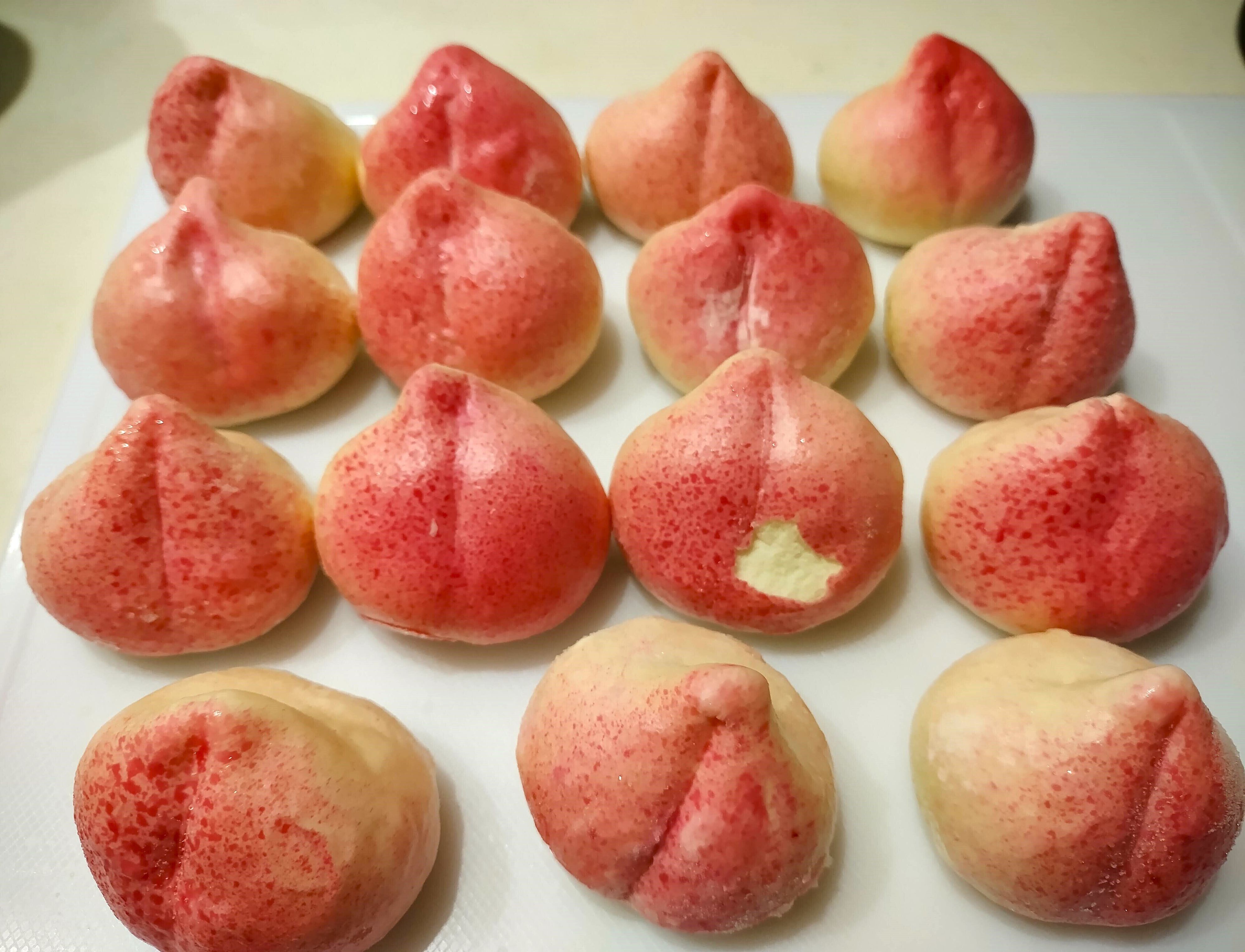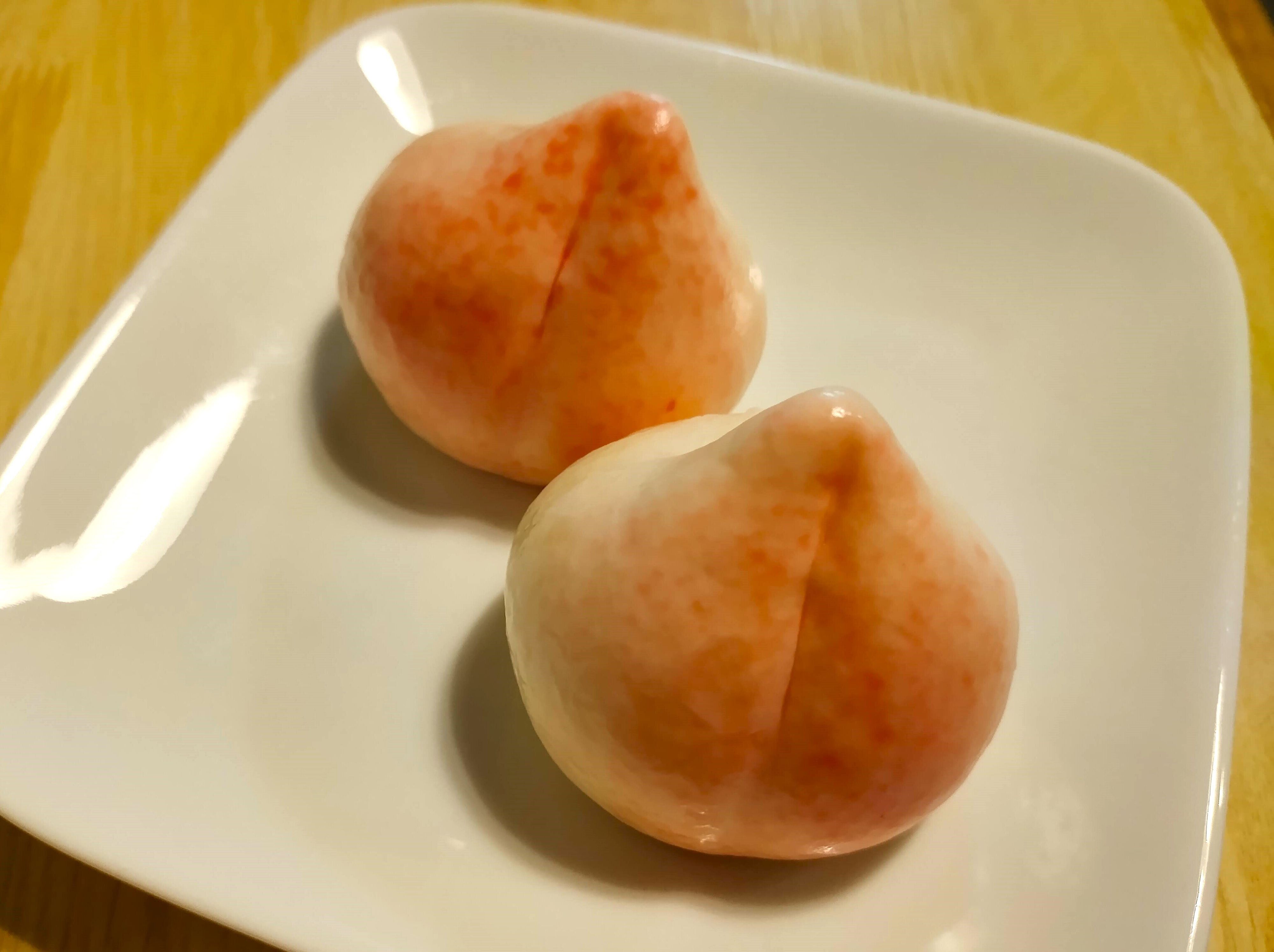 こちらは蒸した桃まんじゅうです。加熱すると皮がふっくらつやっとしておいしそうですね。ちょうどよいサイズ感もグッド。