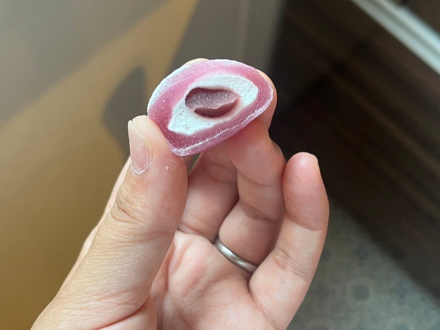 紫芋とかぼちゃ、それぞれのペーストとマシュマロ、おもちの三層になっています。中のペーストは甘さ控えめ。マシュマロとおもちの食感が楽しいおやつです。