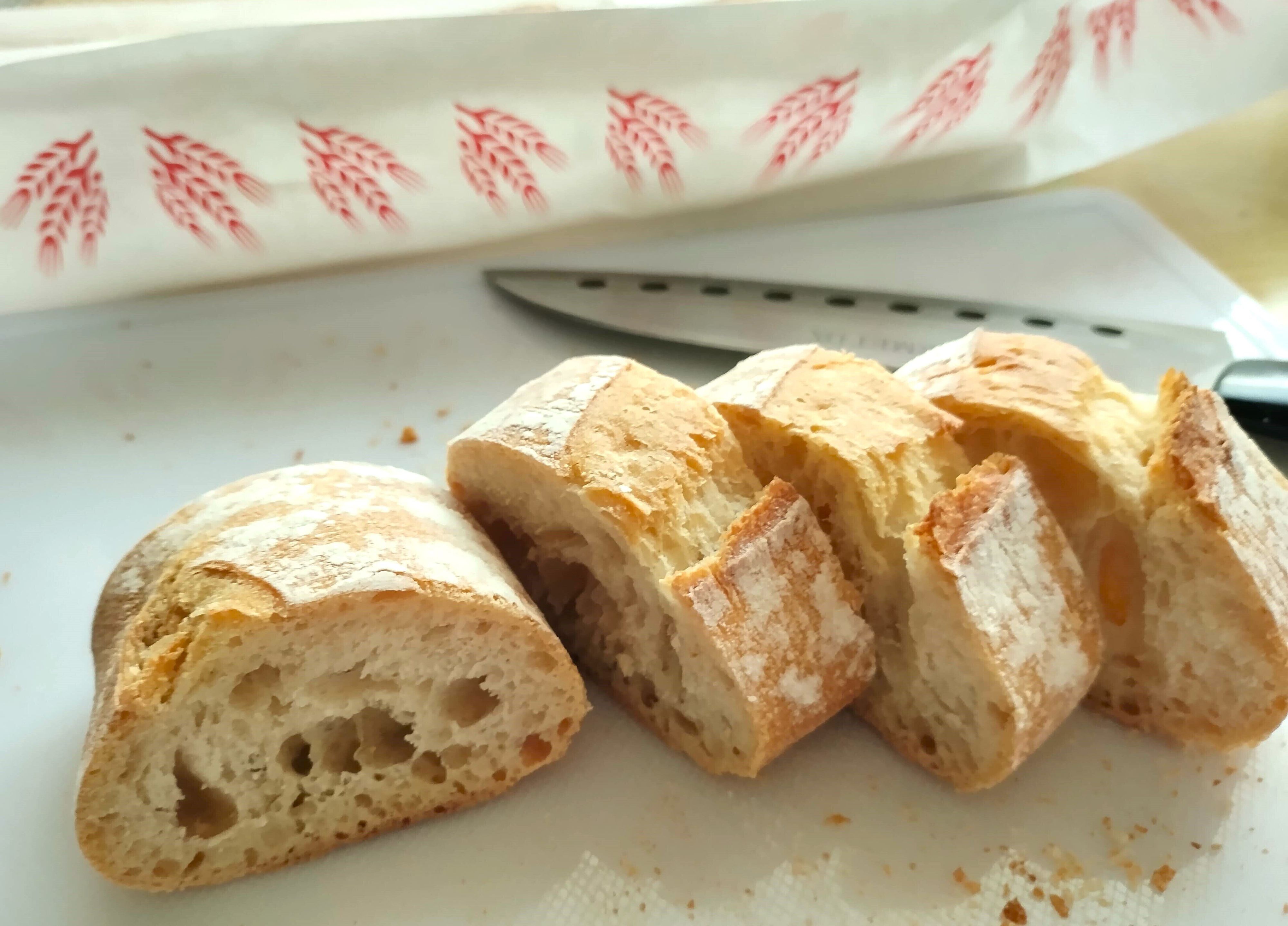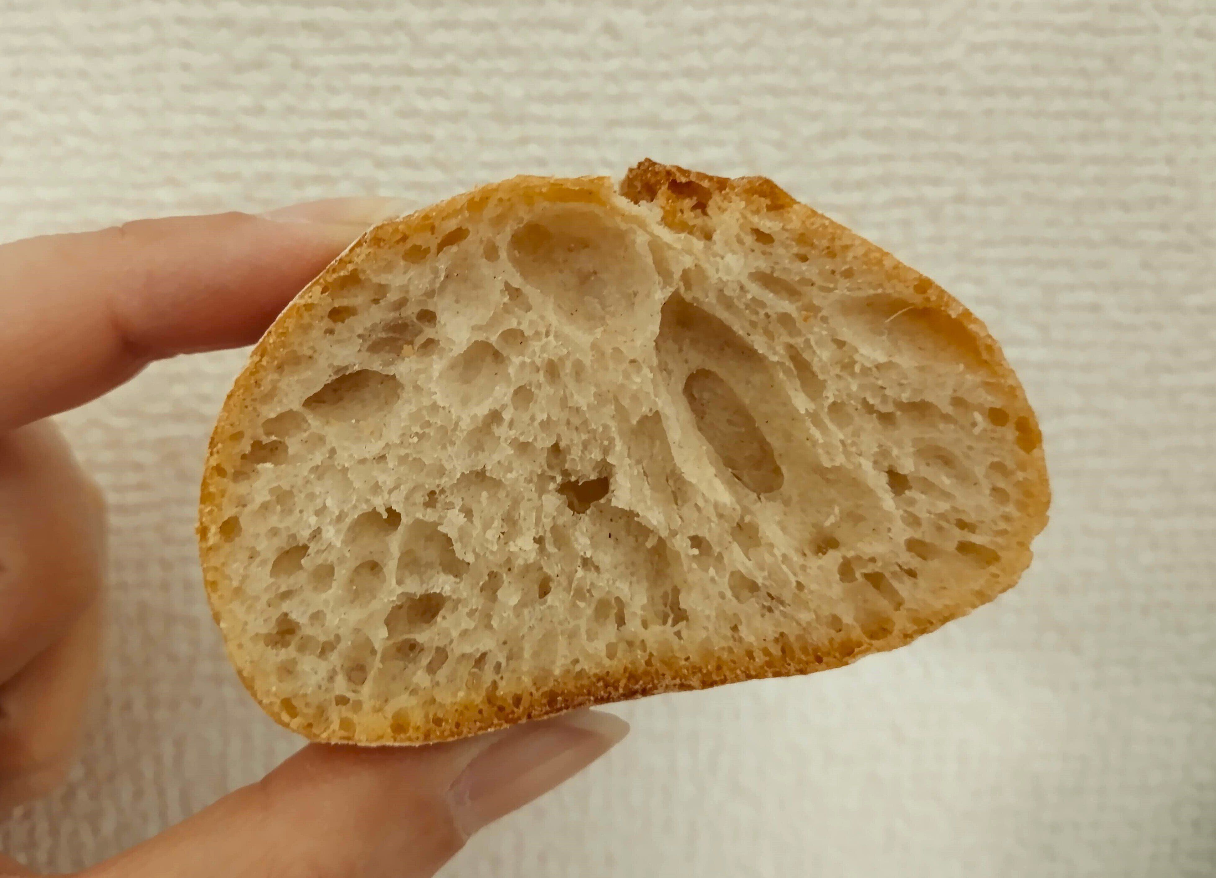 麦芽粉が使われているからか、うっすら茶色な断面です。トースターで焼いて食べると、外側はパリッと、中はモチっとした食感になります。バケットらしいしっかりとした歯ごたえがあります。