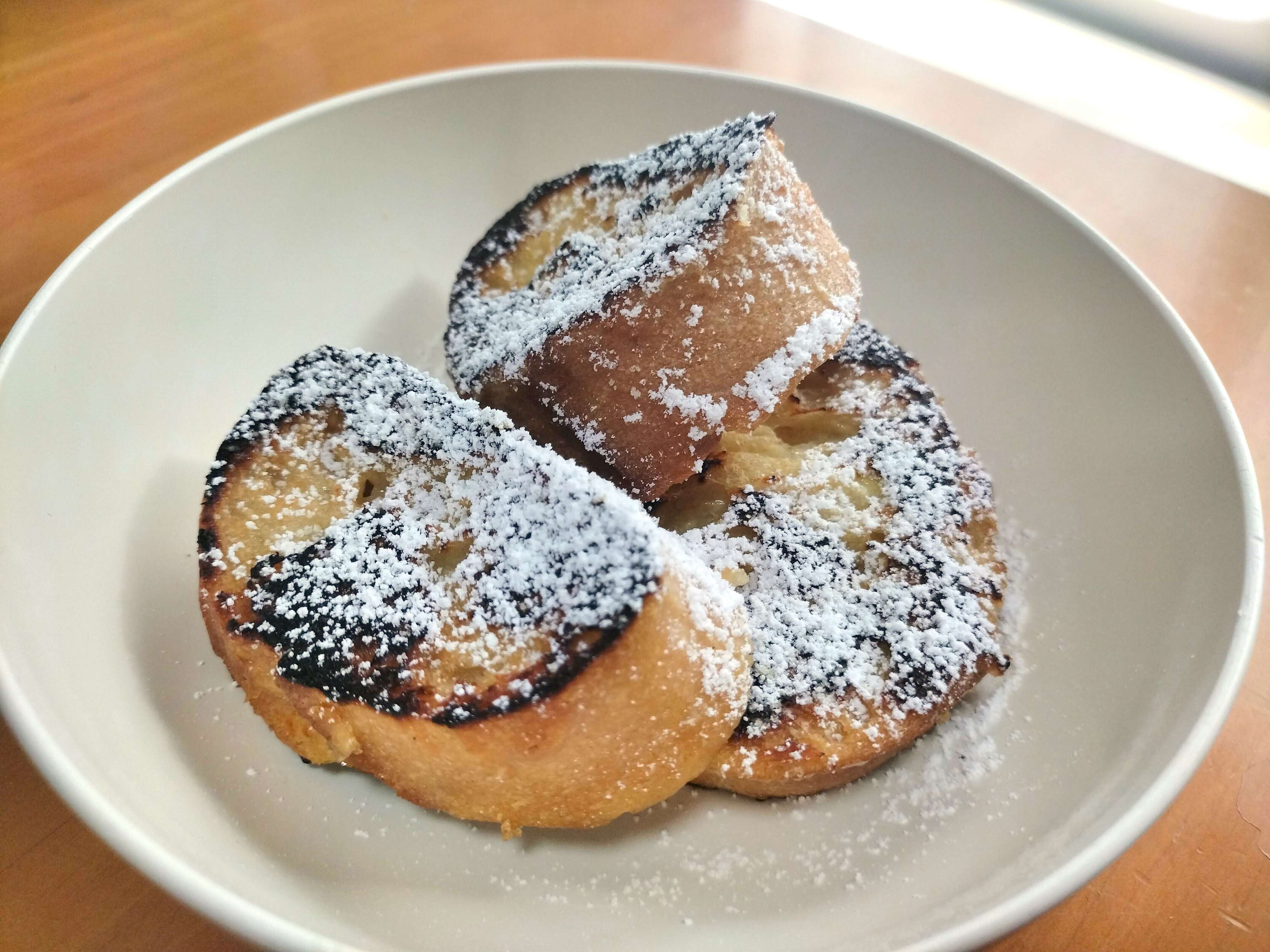 続いて定番のフレンチトースト。バケット自体に甘みがないので、粉砂糖やメープルシロップ、はちみつなどをかけてお召し上がりくださいね。