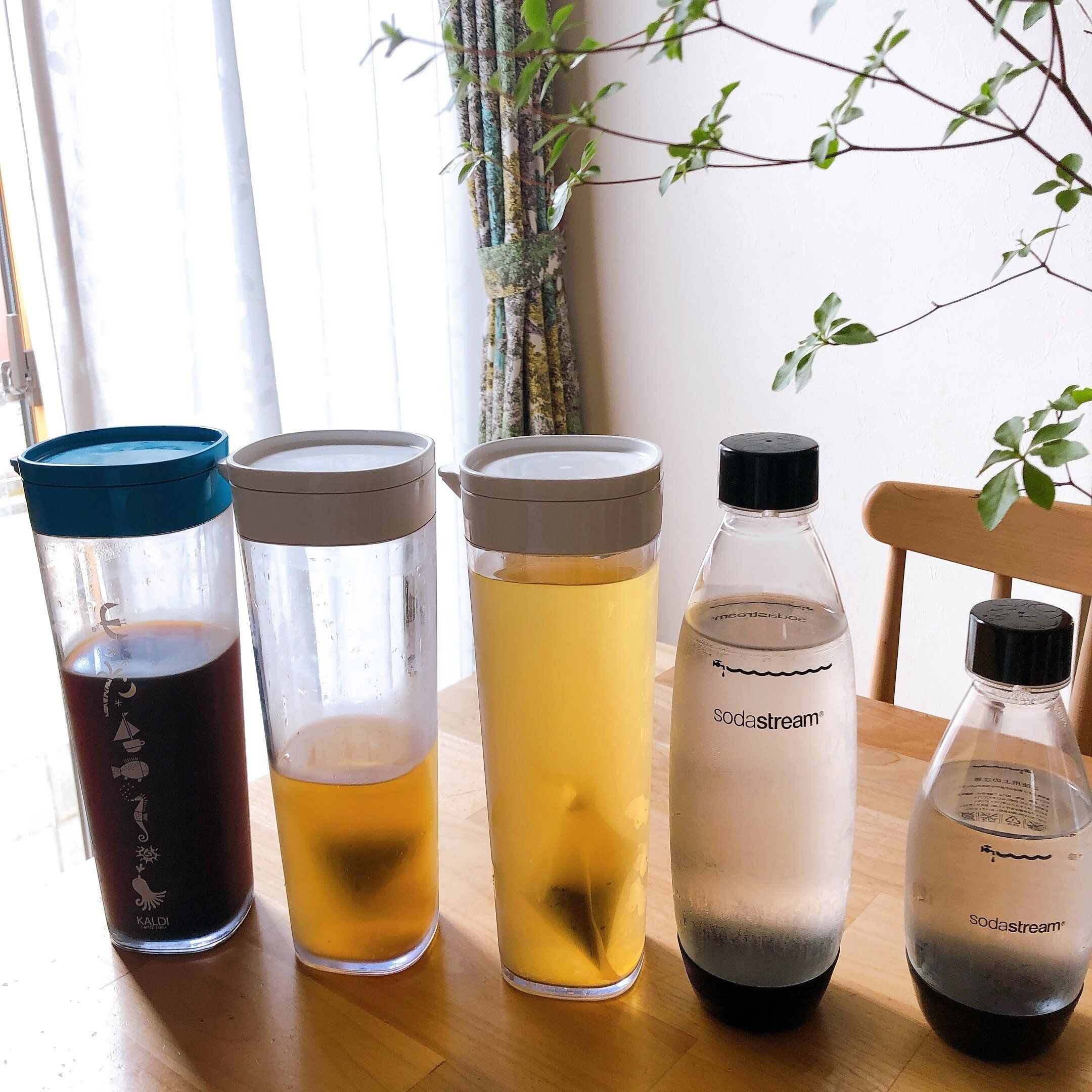 幼稚園と会社に持っていく水筒にはお茶系、私と夫のおやつ時などにアイスコーヒー、炭酸水やお茶は食事時に飲みます。