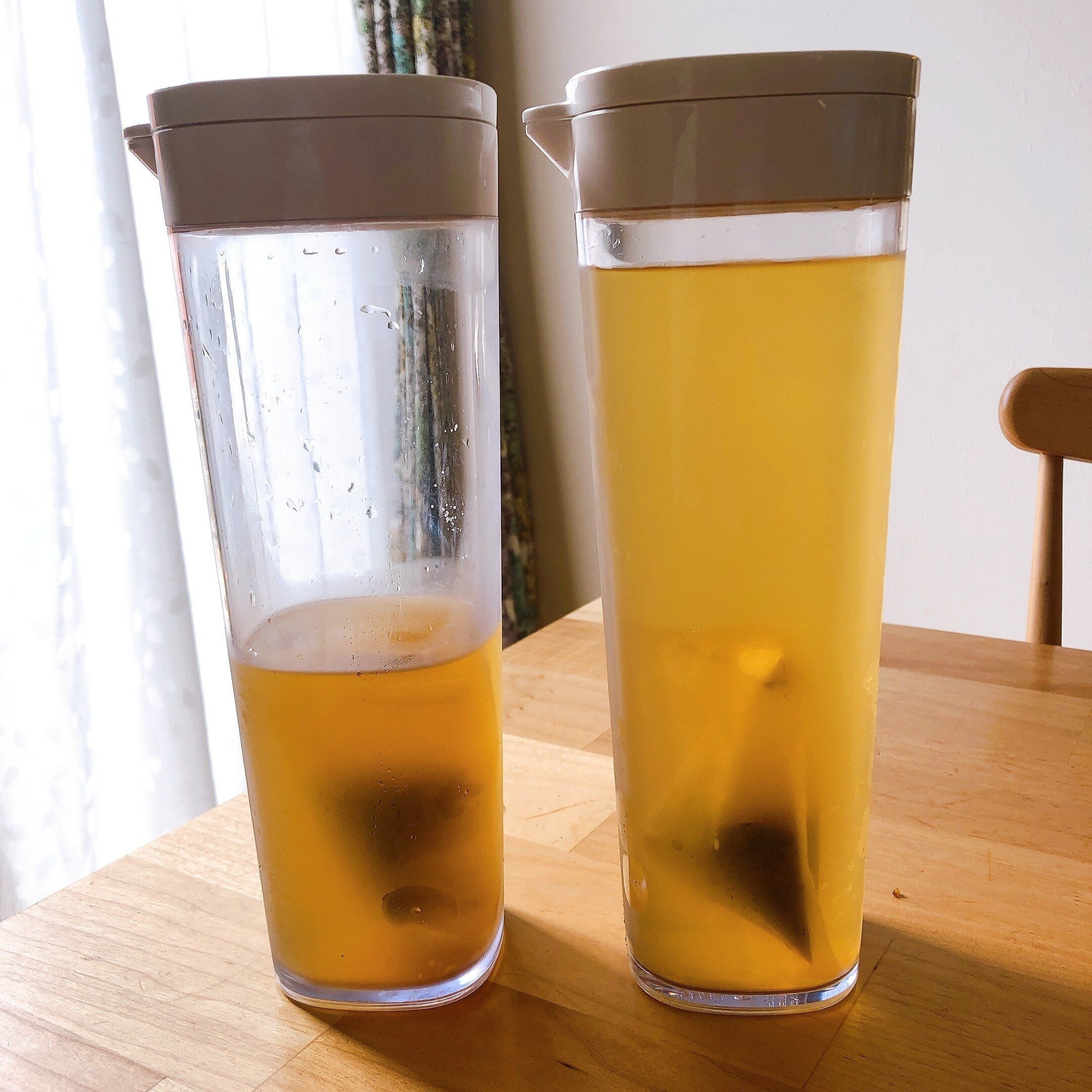 来客があったときには、足りなくなるので同じくニトリのタテヨコスクエアピッチャーの2.2リットル用も用意していますが、家族が飲むだけならお茶用は2本で足りています。