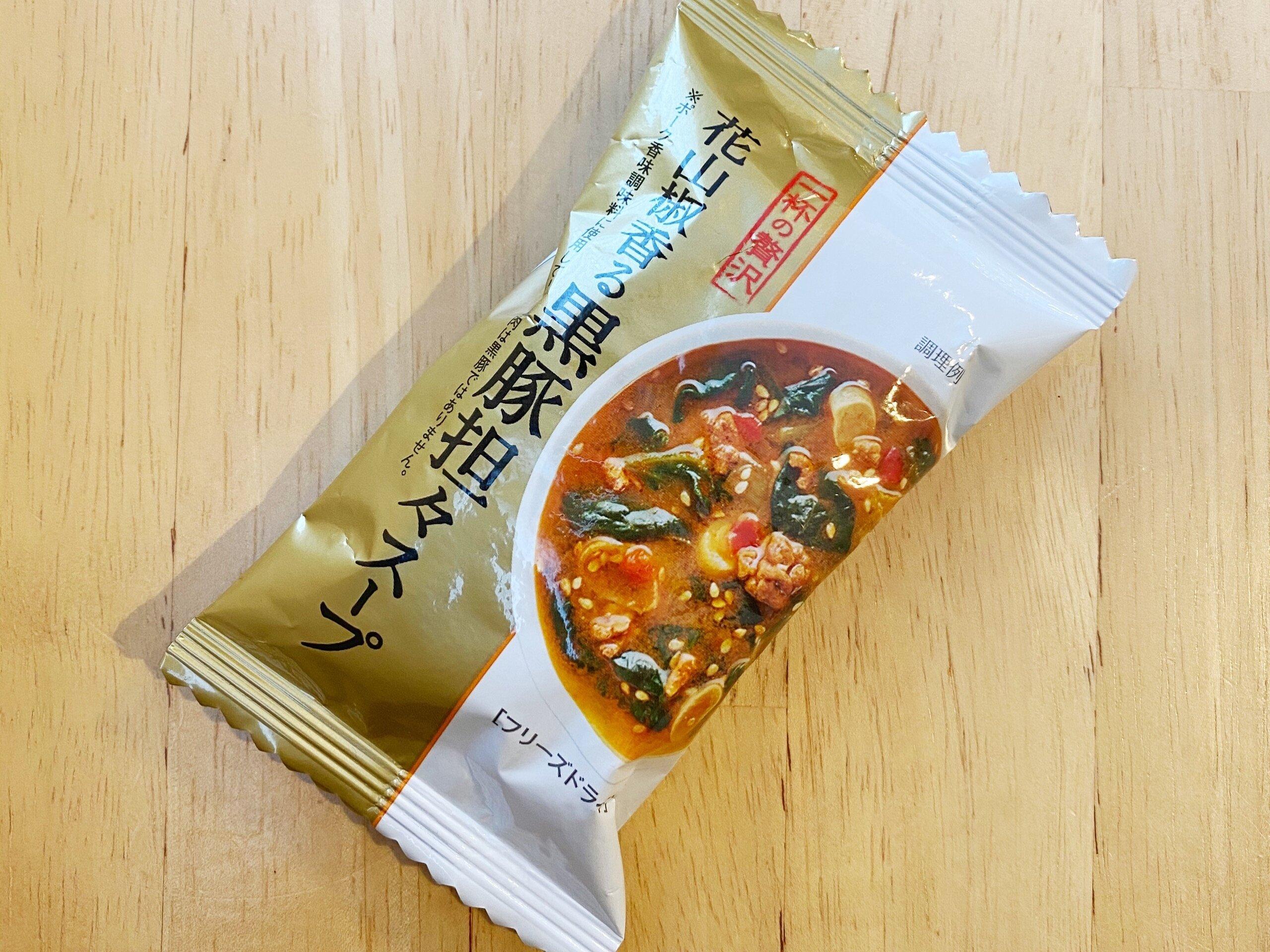 黒豚挽肉の旨みに焙煎したごまの風味、花山椒の香りがアクセントのスープです。お湯を注ぐだけの便利な商品。価格は138円(税込)。