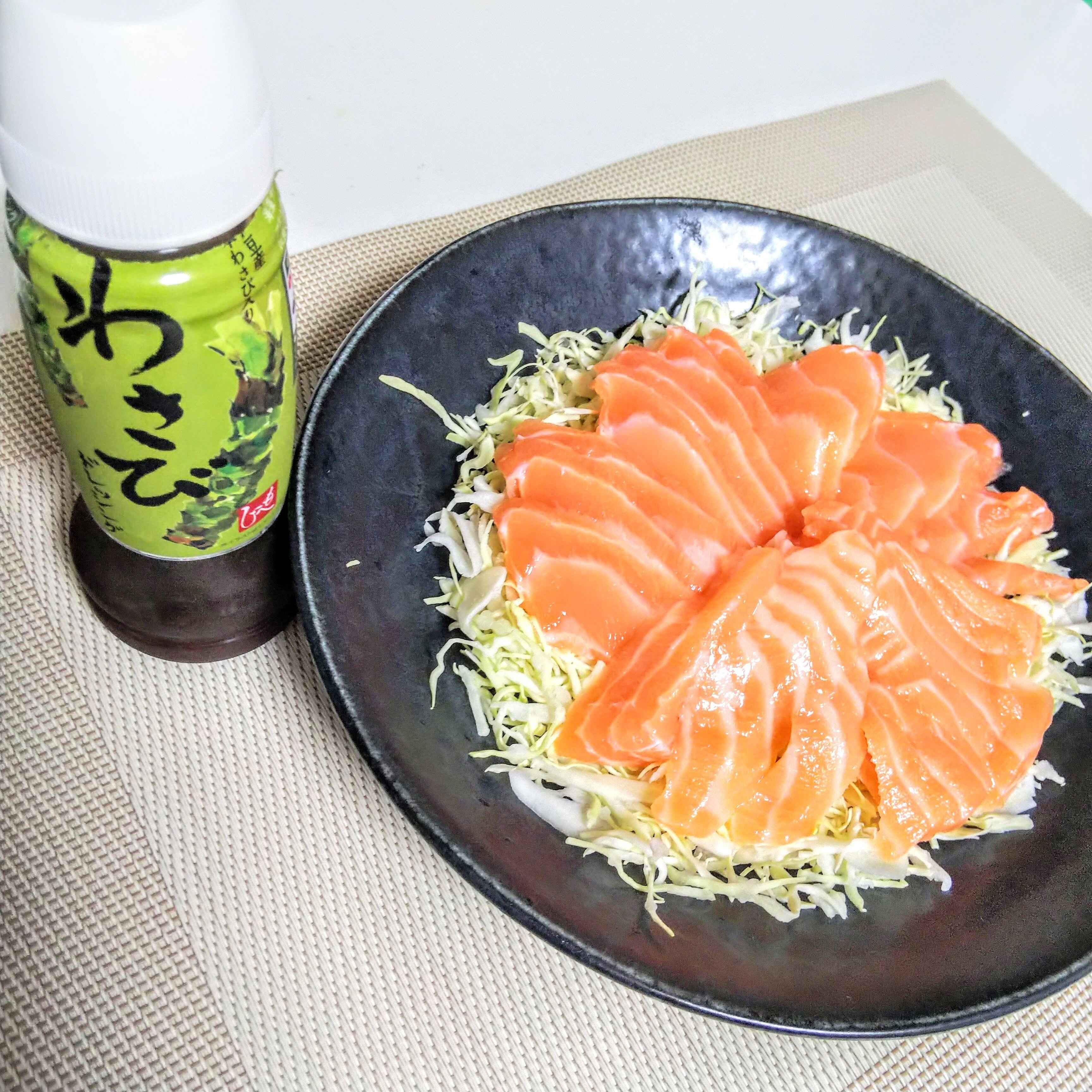 千切りキャベツの上にサーモンをカットしてドレッシングをかけるだけ!