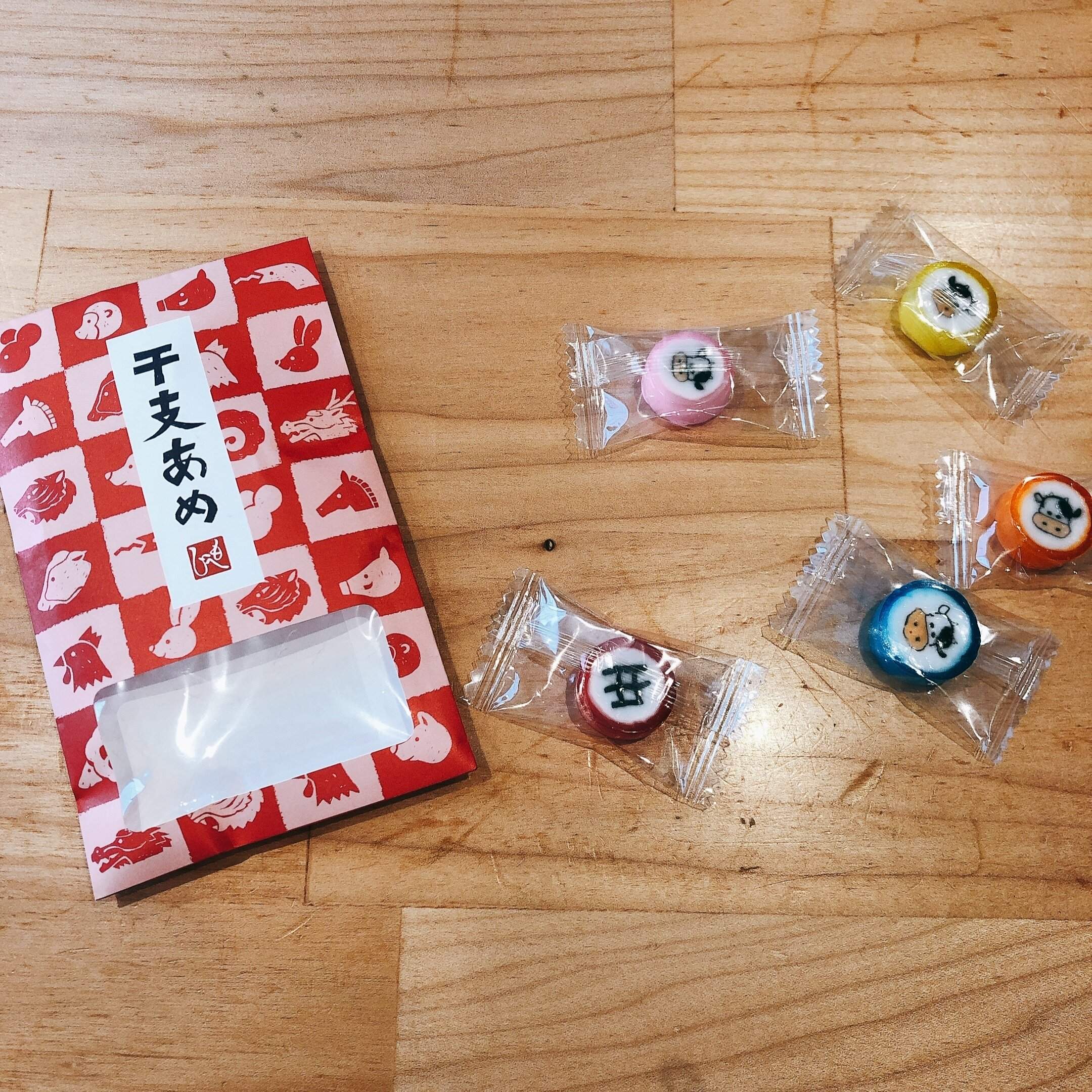 丑の絵と、丑という漢字が描いてある飴が5つ入っています。金太郎飴をカットしたような飴でとてもかわいらしいです。
