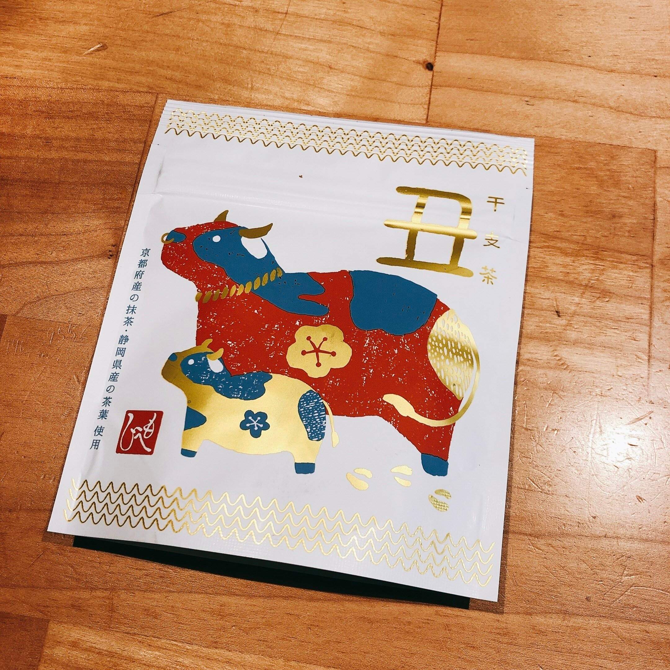 こちらはお菓子ではなくお茶なのですが、パッケージに丑の絵が描かれていて、チャック付きです。抹茶入りの煎茶ティーパックが5袋入っています。