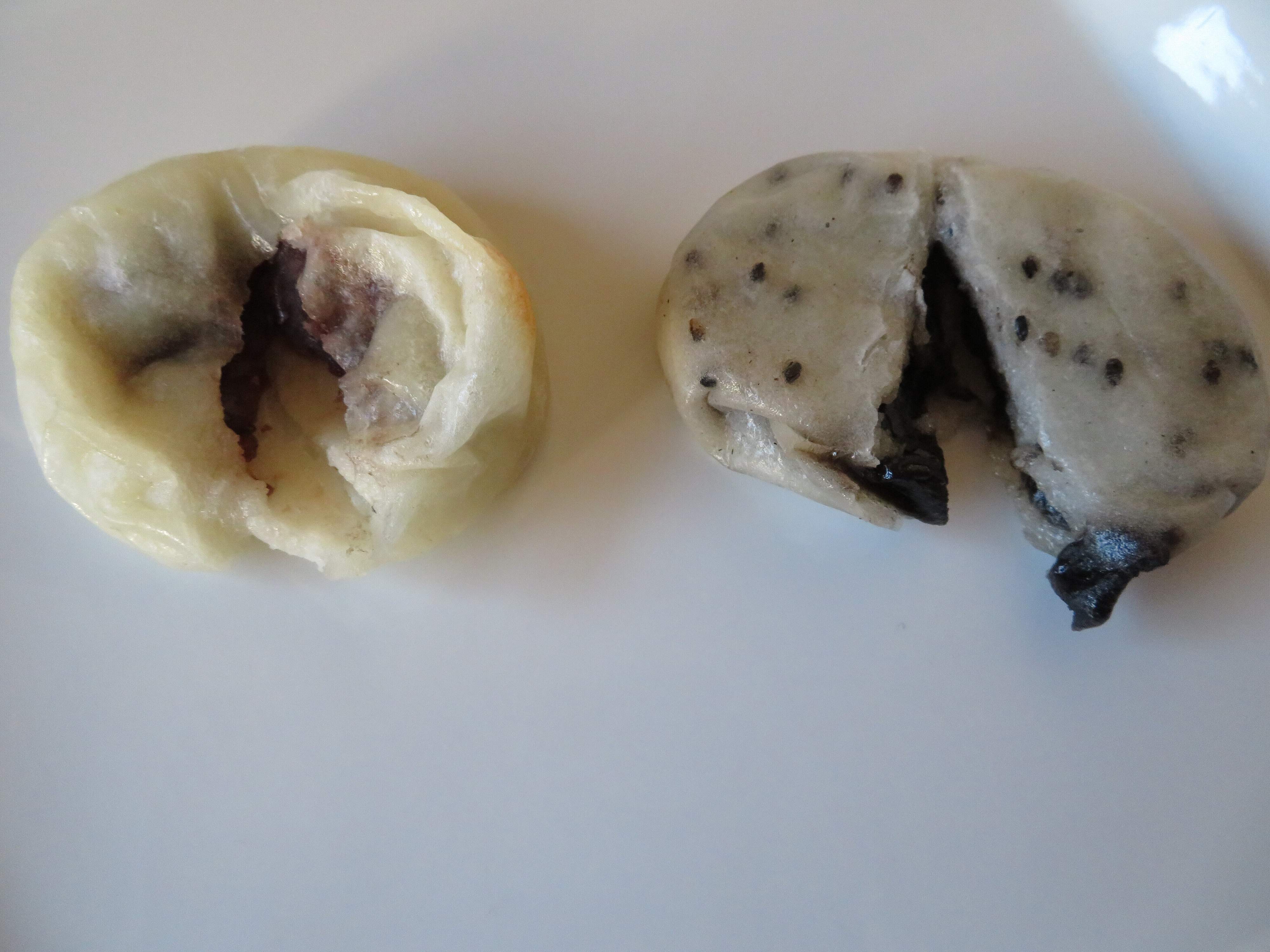 口に含むとモチモチとした食感に加えて、程よい甘さのつぶあんや黒ごまの風味がひろがります。