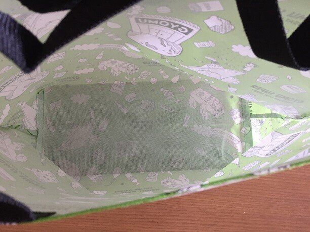 業務スーパーカラーの緑がベースで、イラストがびっしり描かれているなかなかインパクトのあるエコバッグです。