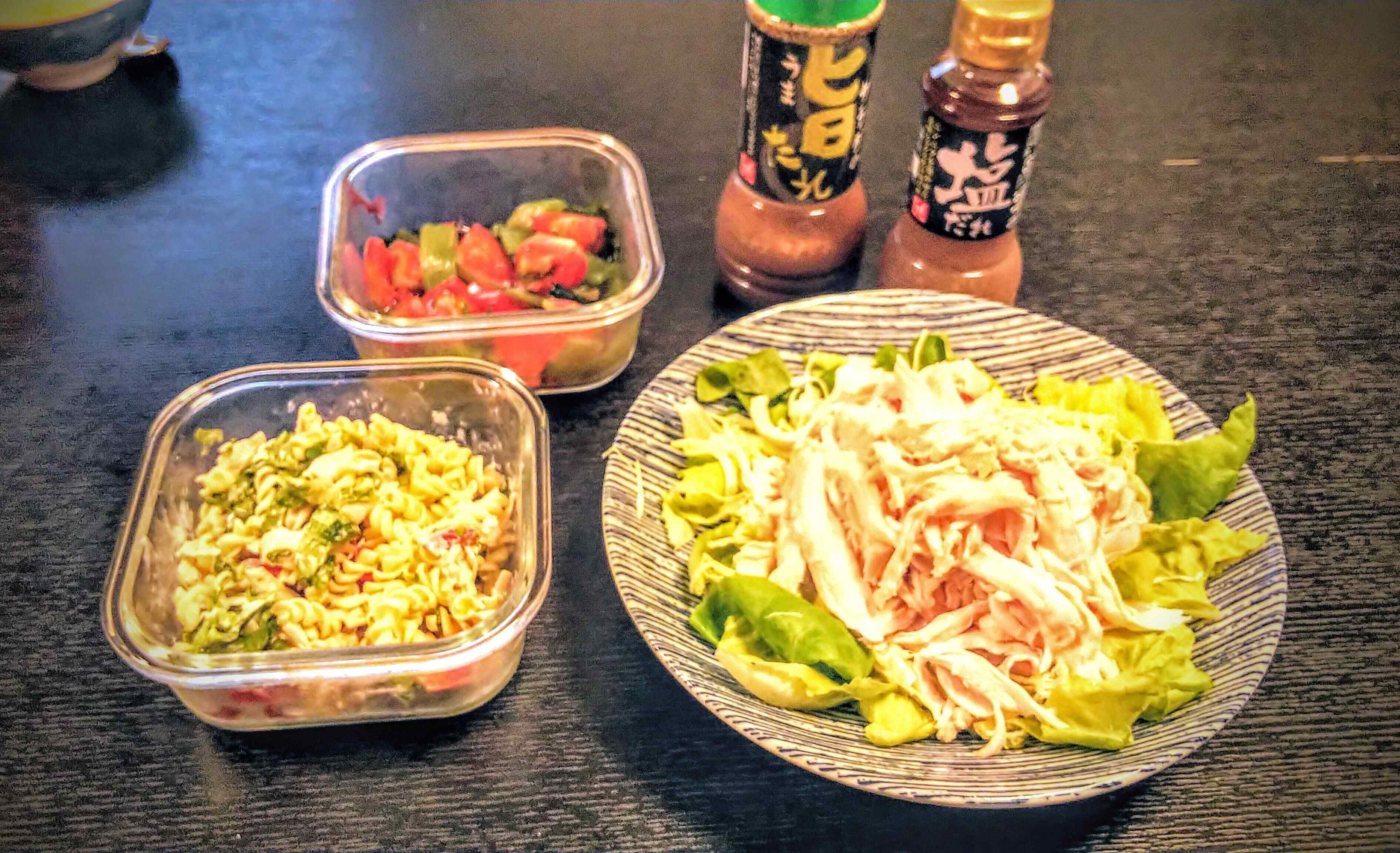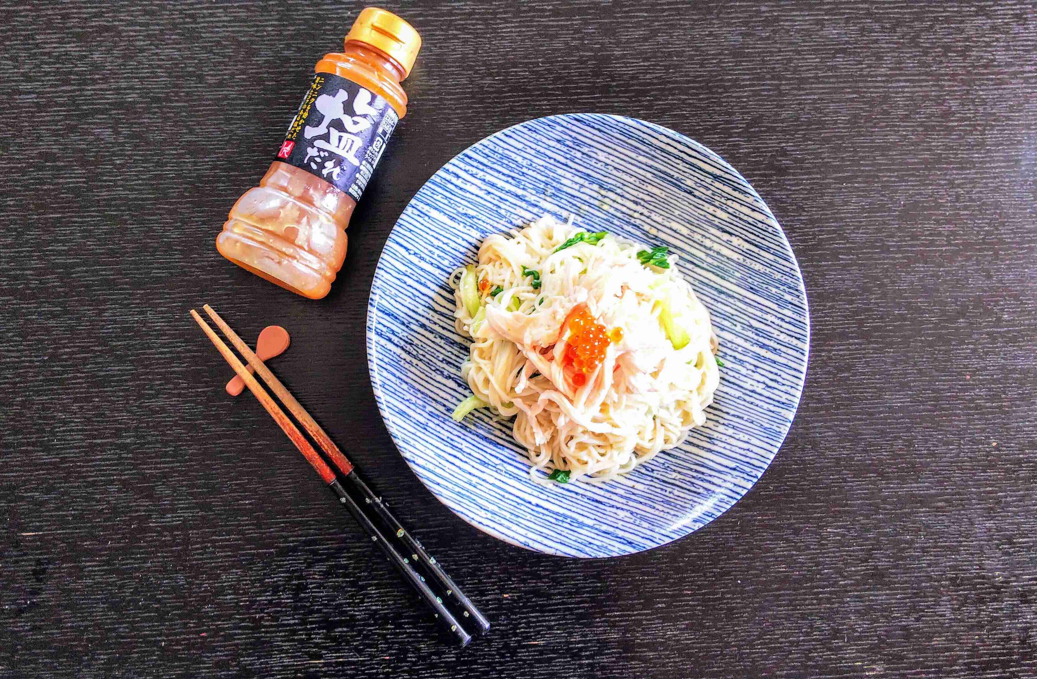 こちらはサラダ素麺に使いました。素麺と小松菜を茹でて、茹で鶏といくら(たまたま冷蔵庫にありました)をのせたもの。