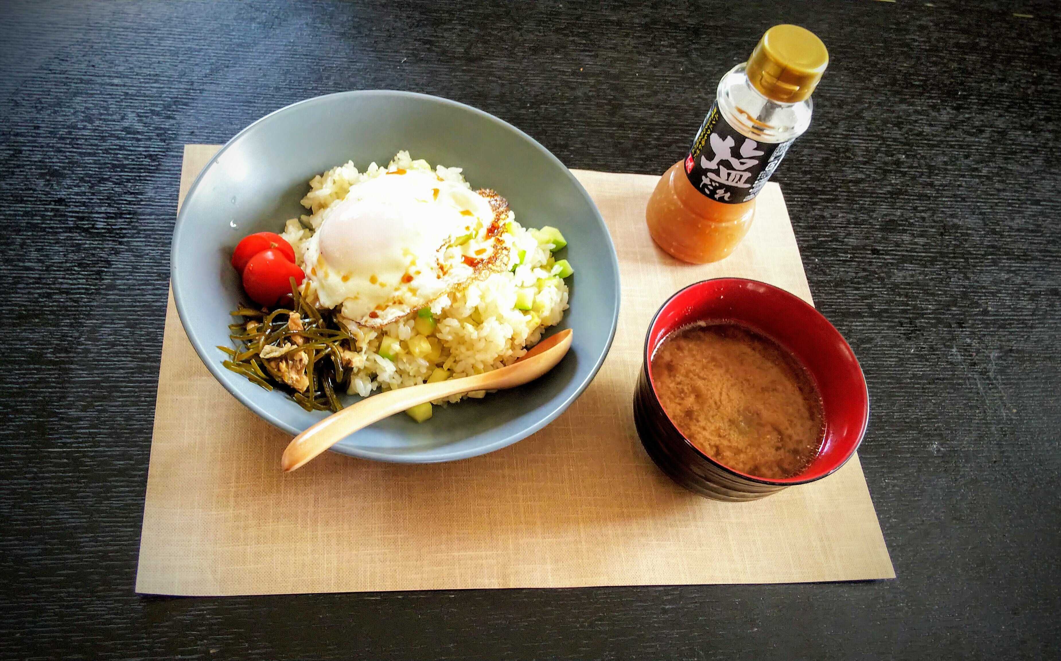 「塩だれ」大さじ1ほどで十分な味がつきます。大盤振る舞いで目玉焼きをのせてみたら、めっちゃ合う!最高の組み合わせです。目玉焼きに塩だれでも美味しい気がします。