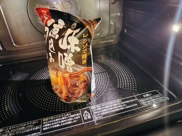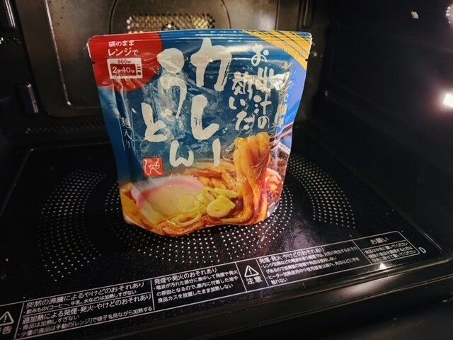 続いて味噌煮込みうどんも温めていきます。温めると袋がかなり膨張するのでしぼむまで開けるのを控えましょう。