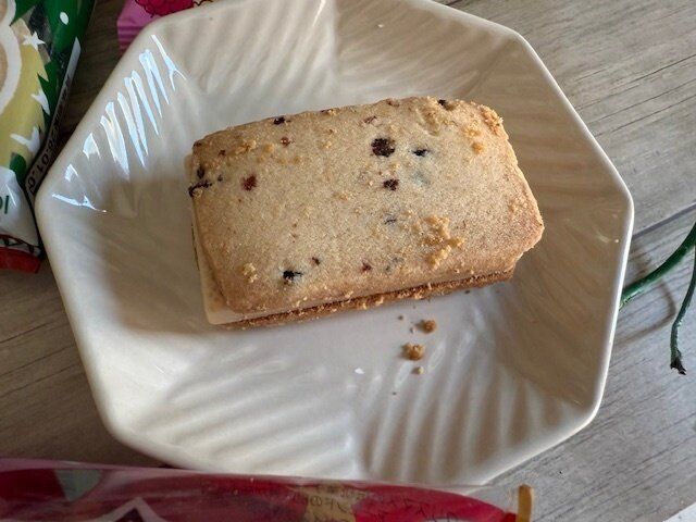 まず一口目に感じるのが、クッキーの“サクッ”とした軽い食感。噛むたびにパリン、と心地よく砕けて、それだけで気分がほぐれる感じ。クッキー自体は甘すぎず、そこにほのかに香るシナモンやクローブが、冬らしいあたたかみをプラス。