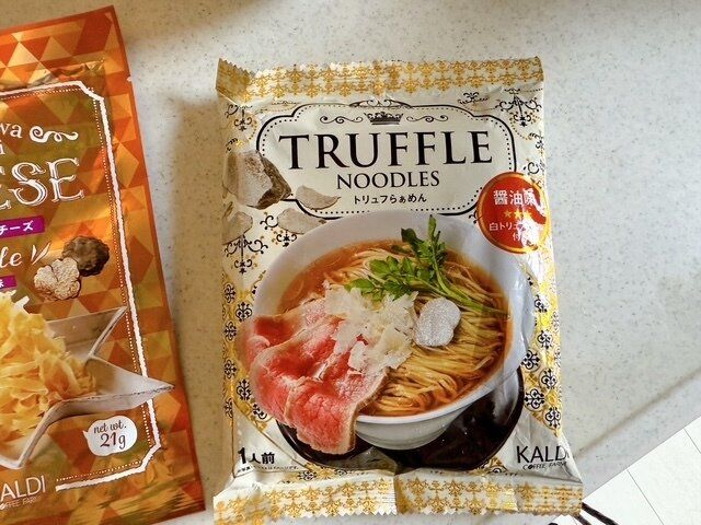 まずは「トリュフらぁめん」のご紹介です。【カルディ】トリュフらぁめん(醤油味)1人前210円。