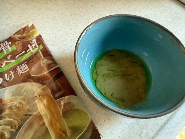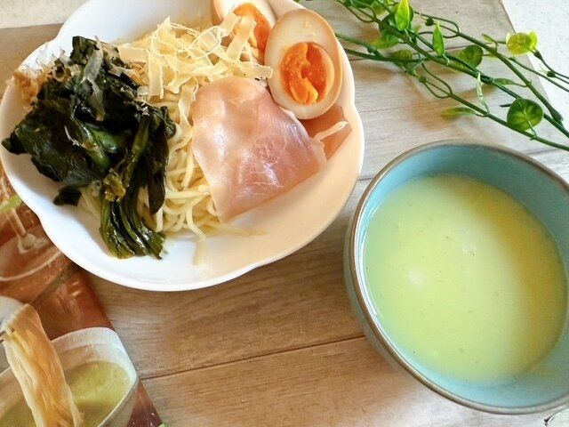 スープの色はきれいな緑色です。こちらに麺をつけて、食べました。